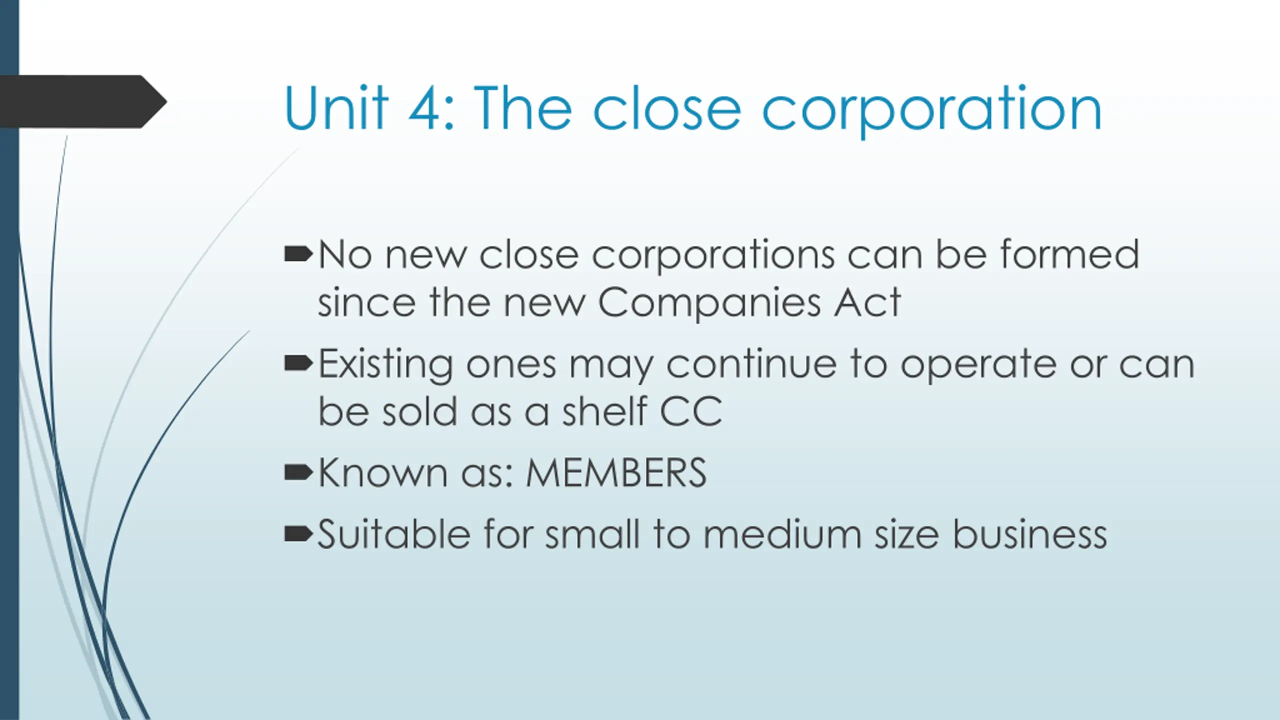 Unit 4: The close corporation No new close corporations can be formed since the new Companies Act Existing ones may continue to operate or can be sold as a shelf CC Known as: MEMBERS Suitable for small to medium size business