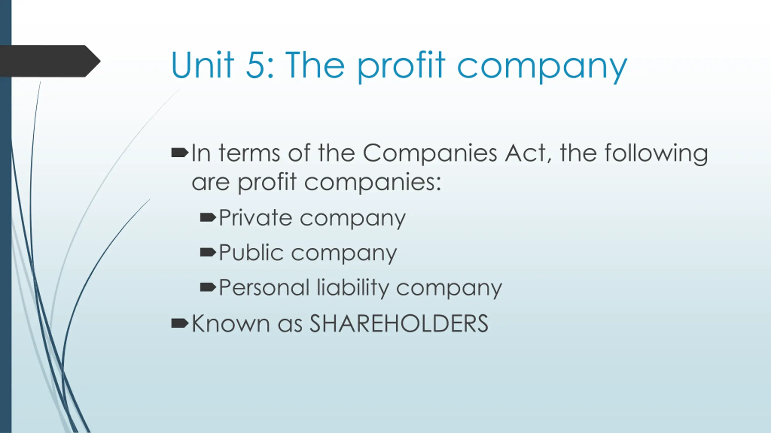 Unit 5: The profit company In terms of the Companies Act, the following are profit companies: Private company Public company Personal liability company Known as SHAREHOLDERS