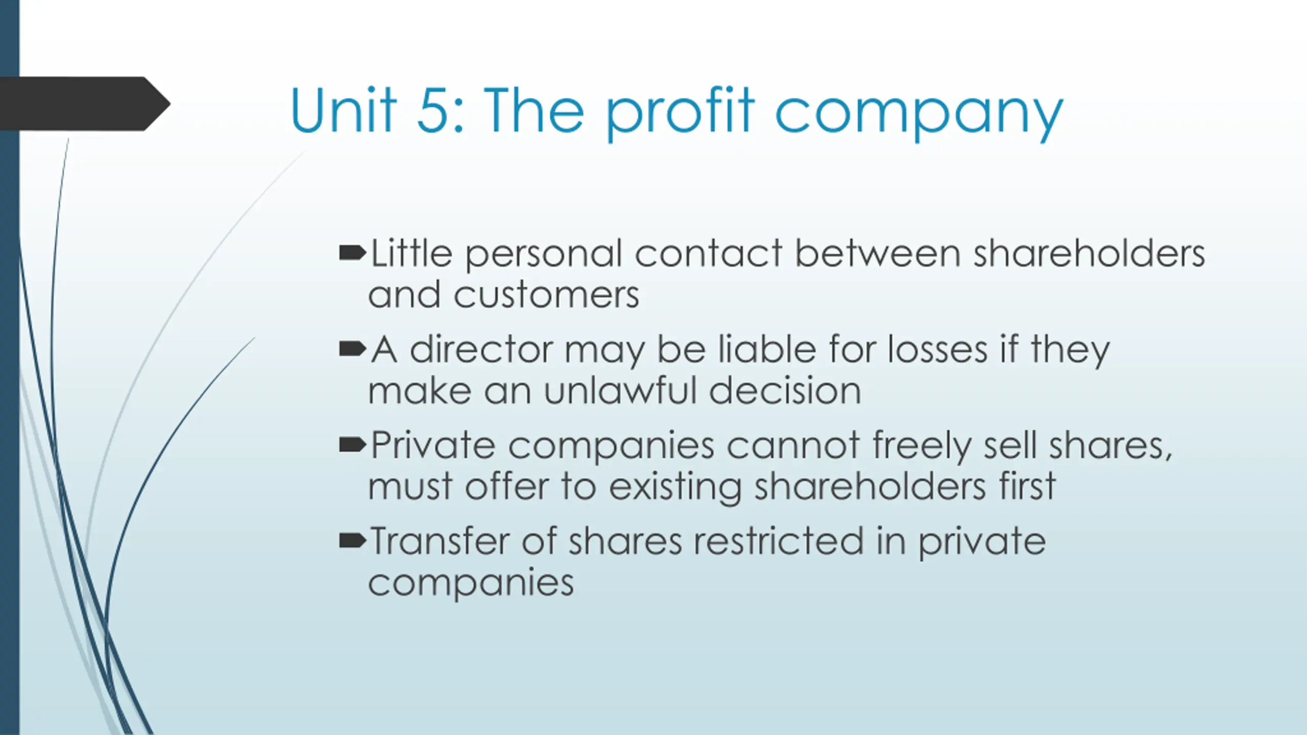 Unit 5: The profit company Little personal contact between shareholders and customers A director may be liable for losses if they make an unlawful decision Private companies cannot freely sell shares, must offer to existing shareholders first Transfer of shares restricted in private companies
