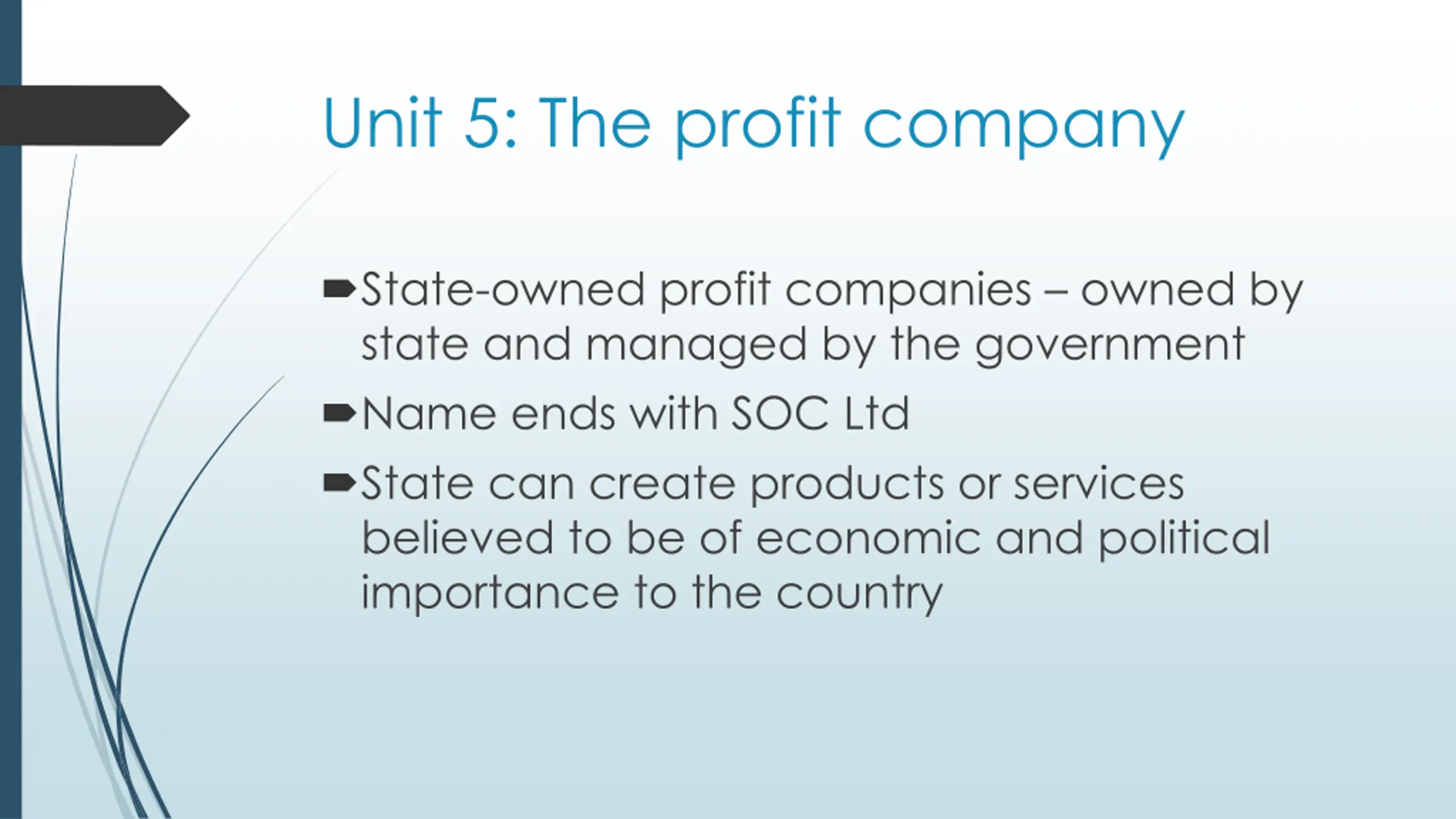 Unit 5: The profit company State-owned profit companies owned by state and managed by the government Name ends with SOC Ltd State can create products or services believed to be of economic and political importance to the country
