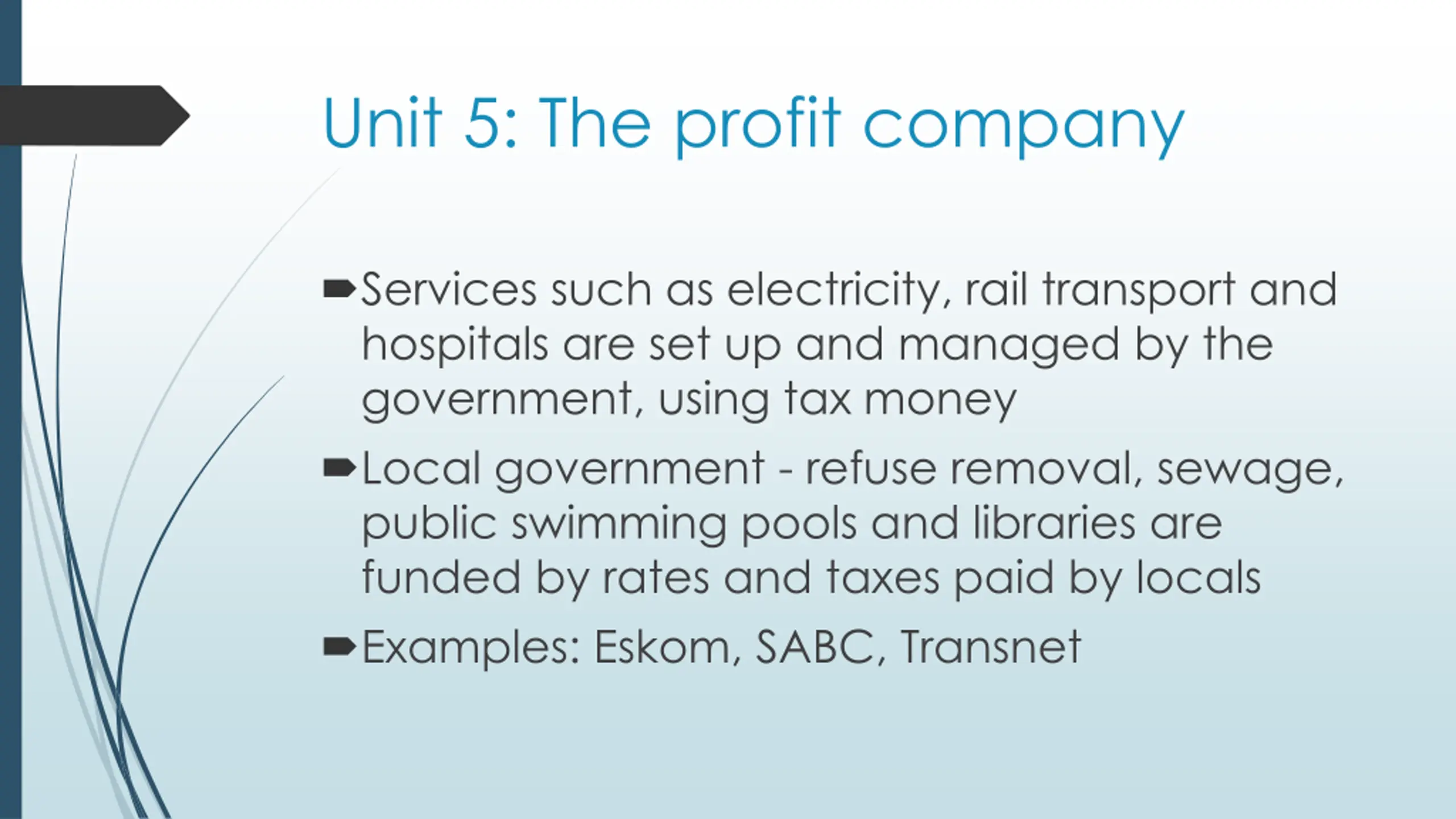Unit 5: The profit company Services such as electricity, rail transport and hospitals are set up and managed by the government, using tax money Local government - refuse removal, sewage, public swimming pools and libraries are funded by rates and taxes paid by locals Examples: Eskom, SABC, Transnet