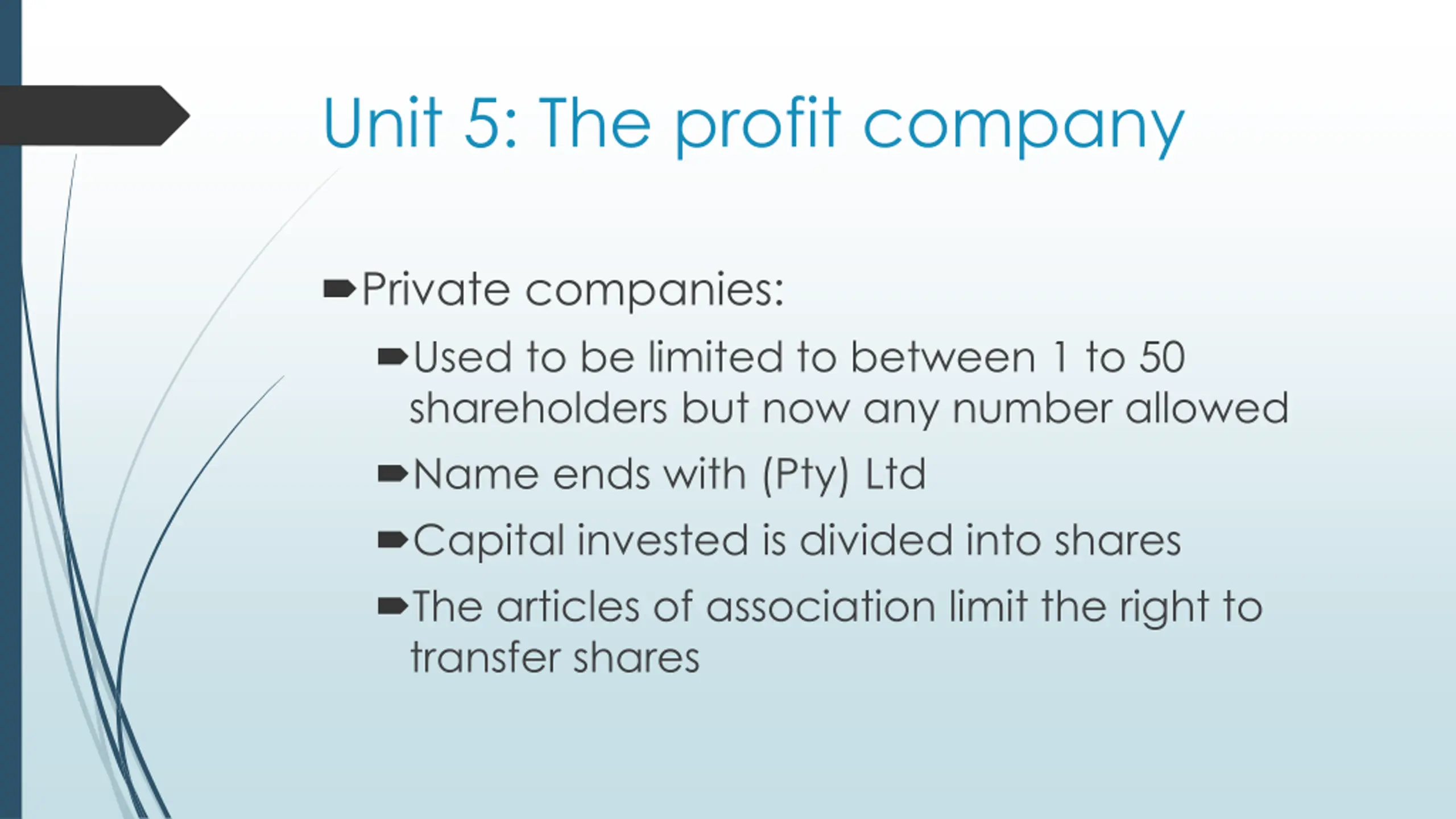 Unit 5: The profit company Private companies: Used to be limited to between 1 to 50 shareholders but now any number allowed Name ends with (Pty) Ltd Capital invested is divided into shares The articles of association limit the right to transfer shares