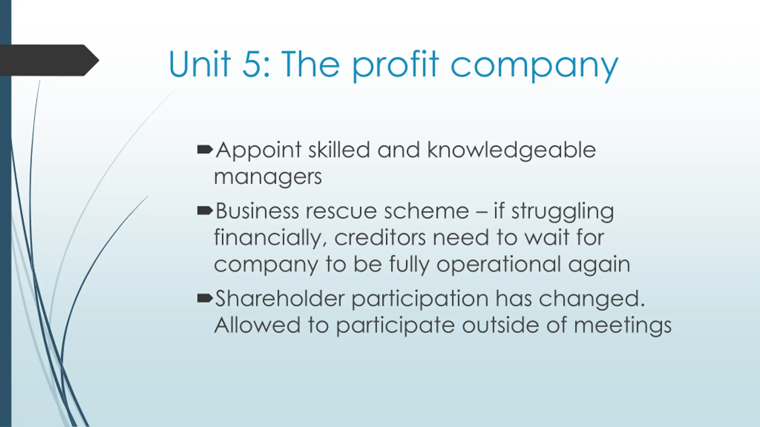Unit 5: The profit company Appoint skilled and knowledgeable managers Business rescue scheme if struggling financially, creditors need to wait for company to be fully operational again Shareholder participation has changed. Allowed to participate outside of meetings
