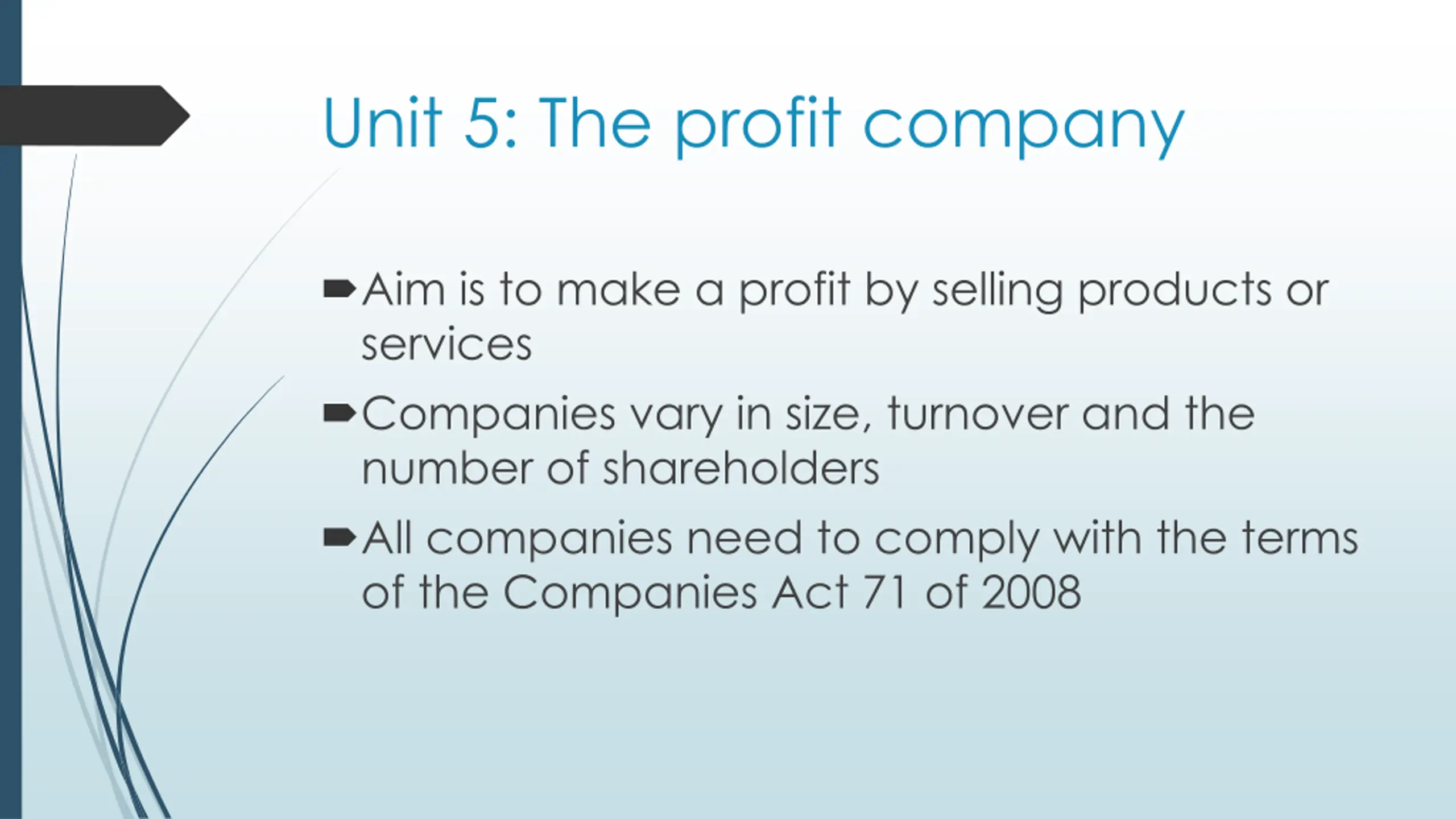 Unit 5: The profit company Aim is to make a profit by selling products or services Companies vary in size, turnover and the number of shareholders All companies need to comply with the terms of the Companies Act 71 of 2008