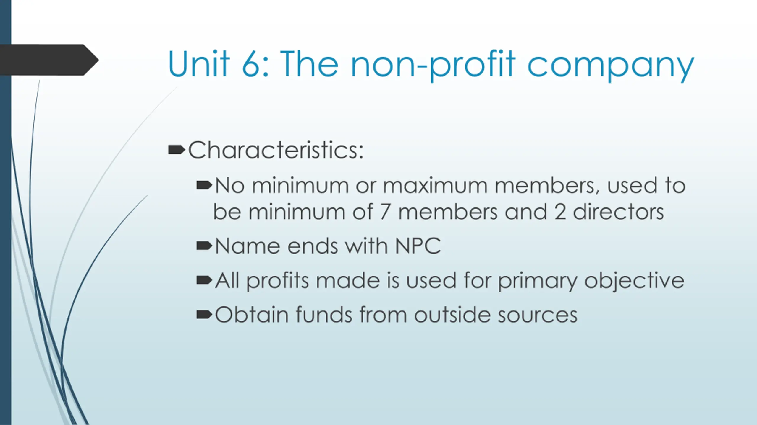 Unit 6: The non-profit company Characteristics: No minimum or maximum members, used to be minimum of 7 members and 2 directors Name ends with NPC All profits made is used for primary objective Obtain funds from outside sources