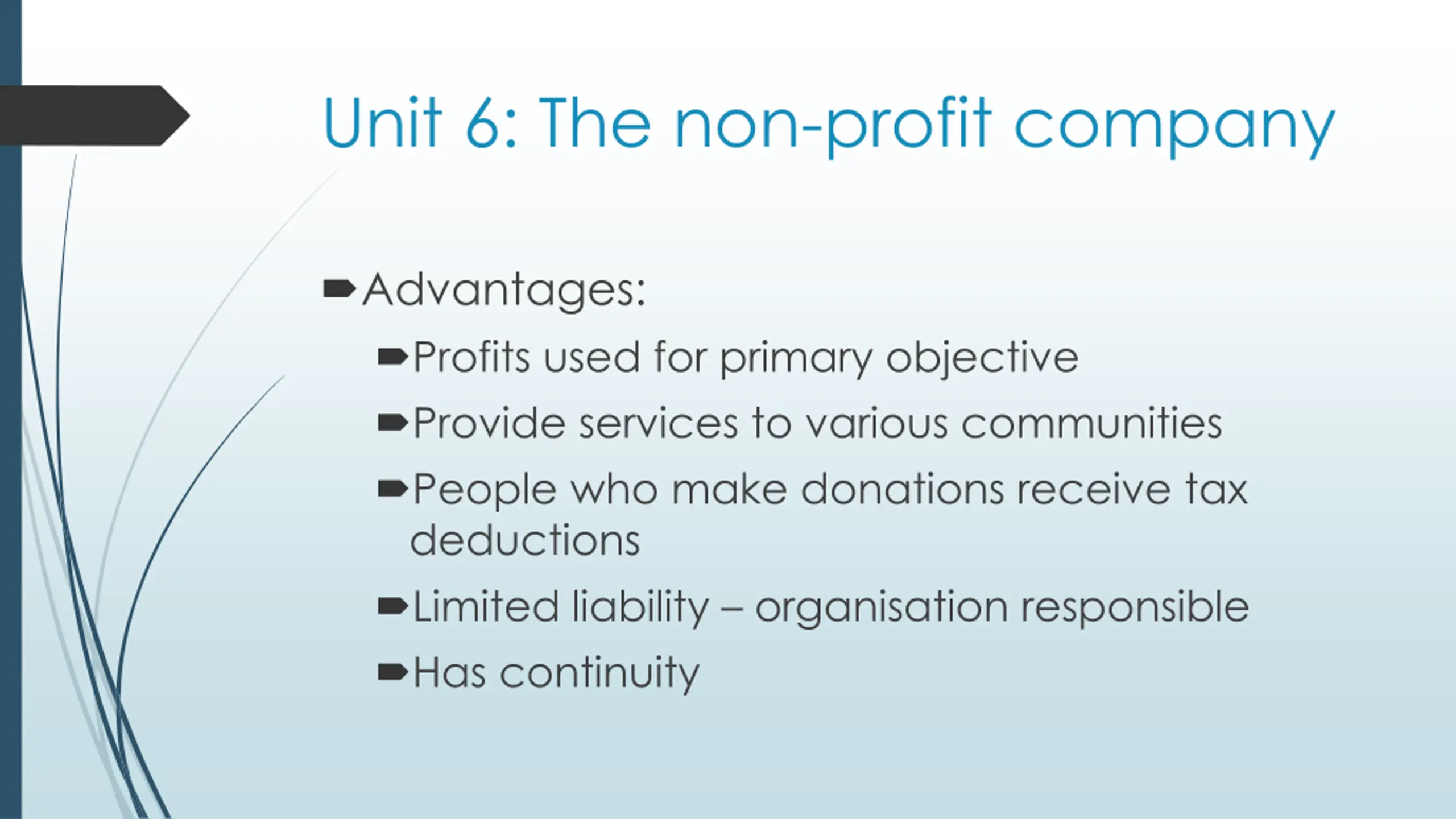 Unit 6: The non-profit company Advantages: Profits used for primary objective Provide services to various communities People who make donations receive tax deductions Limited liability organisation responsible Has continuity