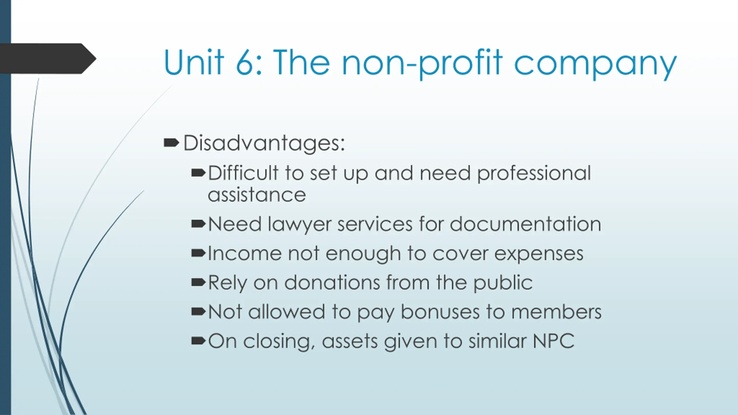 Unit 6: The non-profit company Disadvantages: Difficult to set up and need professional assistance Need lawyer services for documentation Income not enough to cover expenses Rely on donations from the public Not allowed to pay bonuses to members On closing, assets given to similar NPC