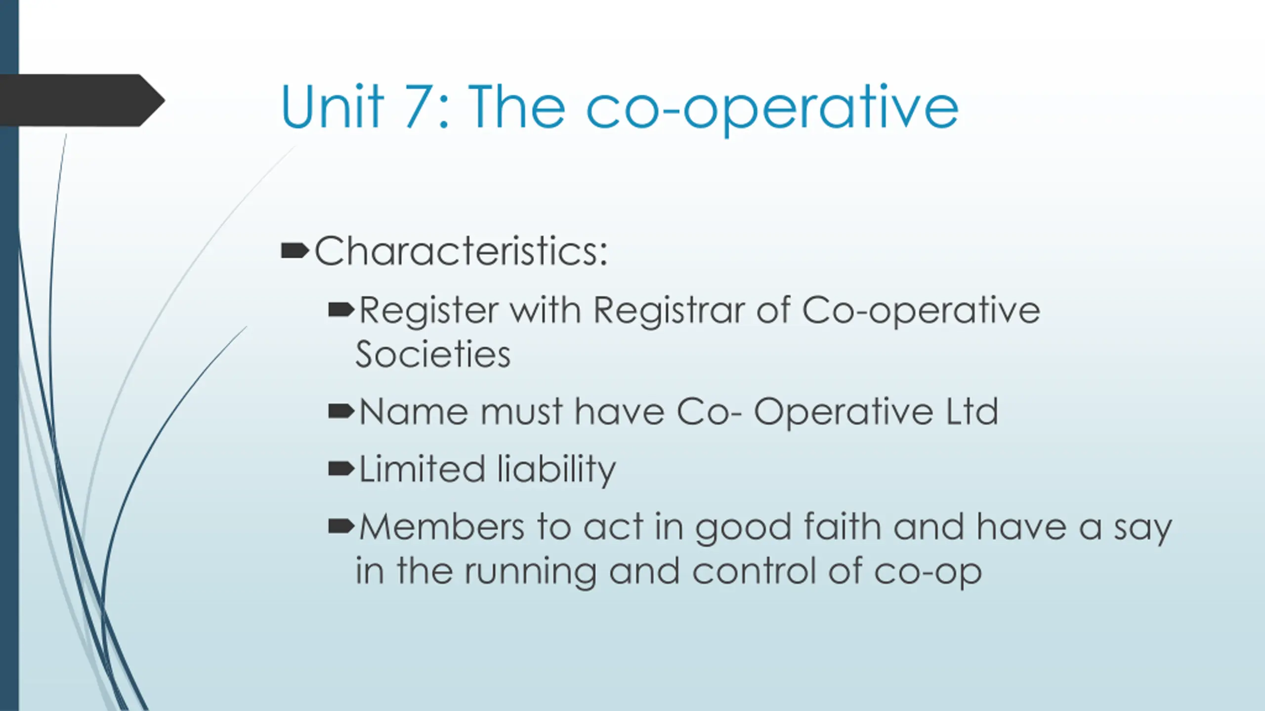 Unit 7: The co-operative Characteristics: Register with Registrar of Co-operative Societies Name must have Co- Operative Ltd Limited liability Members to act in good faith and have a say in the running and control of co-op