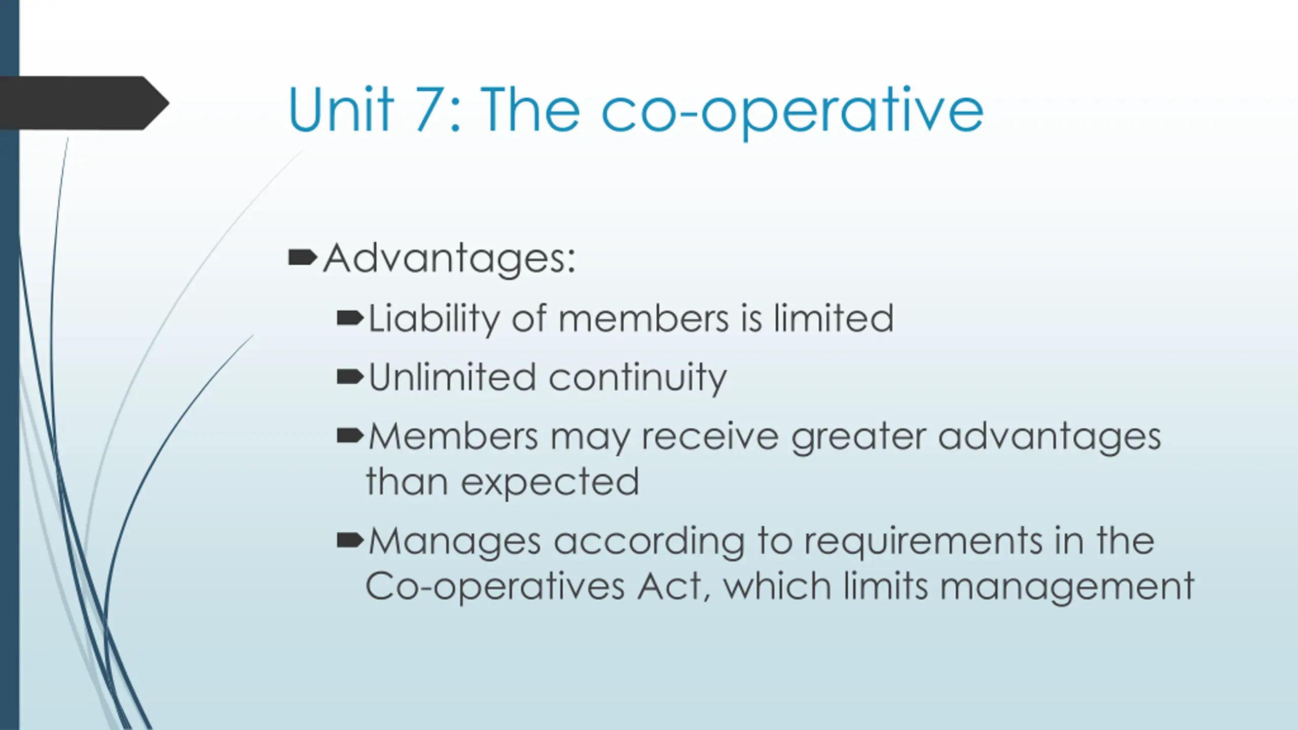 Unit 7: The co-operative Advantages: Liability of members is limited Unlimited continuity Members may receive greater advantages than expected Manages according to requirements in the Co-operatives Act, which limits management