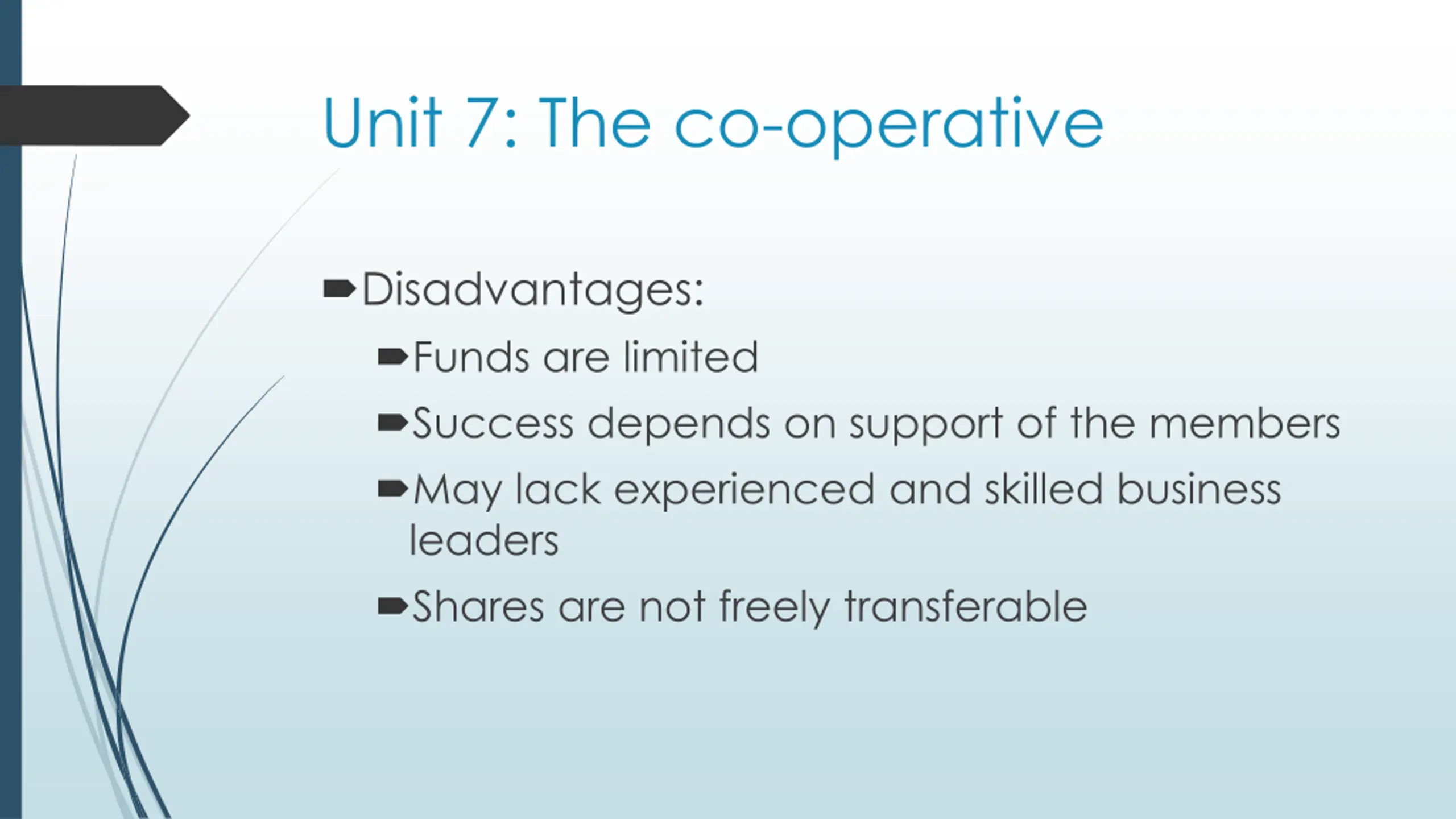 Unit 7: The co-operative Disadvantages: Funds are limited Success depends on support of the members May lack experienced and skilled business leaders Shares are not freely transferable