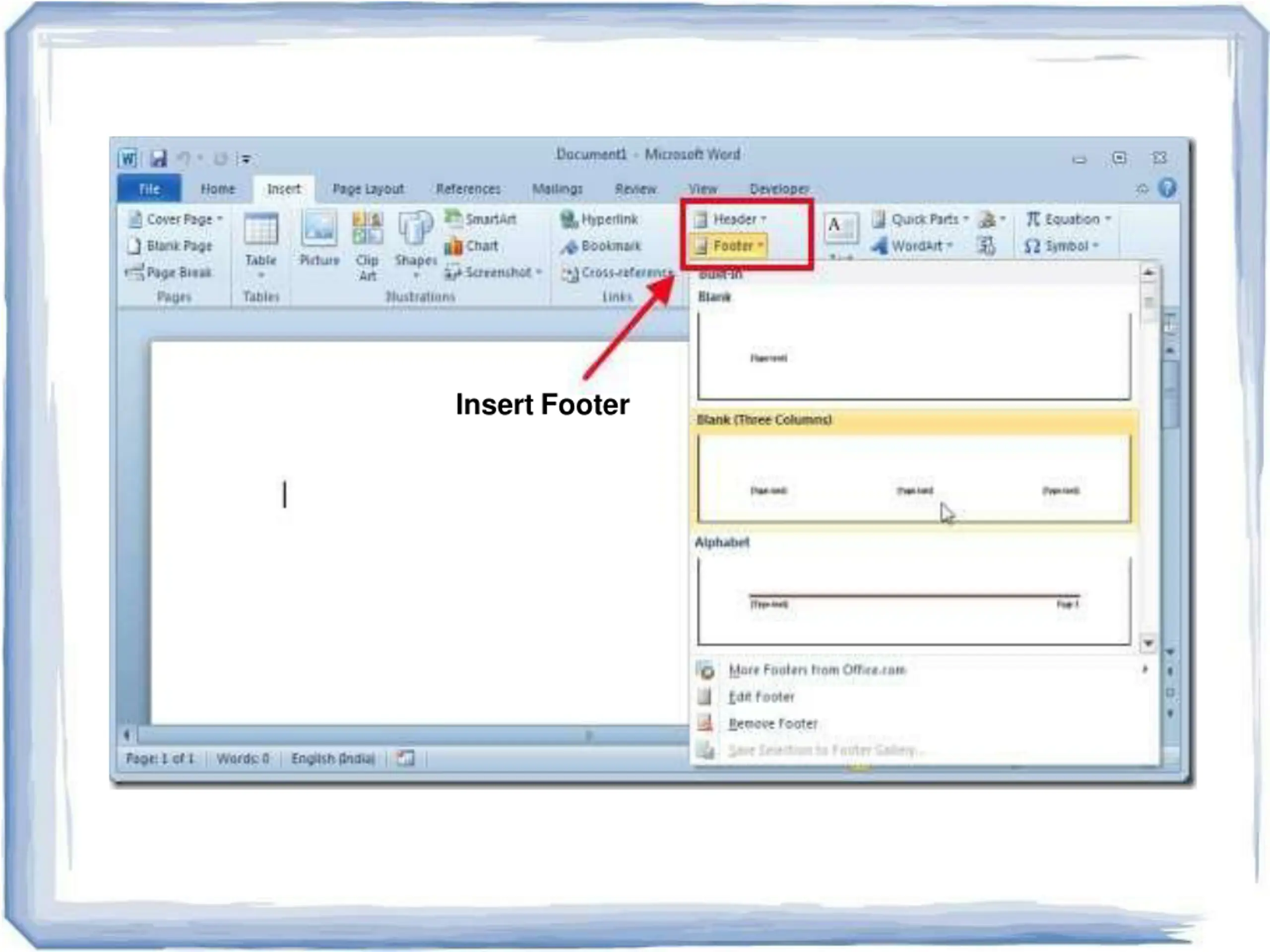 Features of MS Word Creating and saving a file Editing and formatting a document Paragraph formatting Inserting header and footer and Page number Checking spelling and grammar Subscript and superscript Inserting symbols Print preview and printing Inserting clipart, word art, and picture Page setting Bullets and number Border and shading Searching a word and replacing it by another word Inserting table