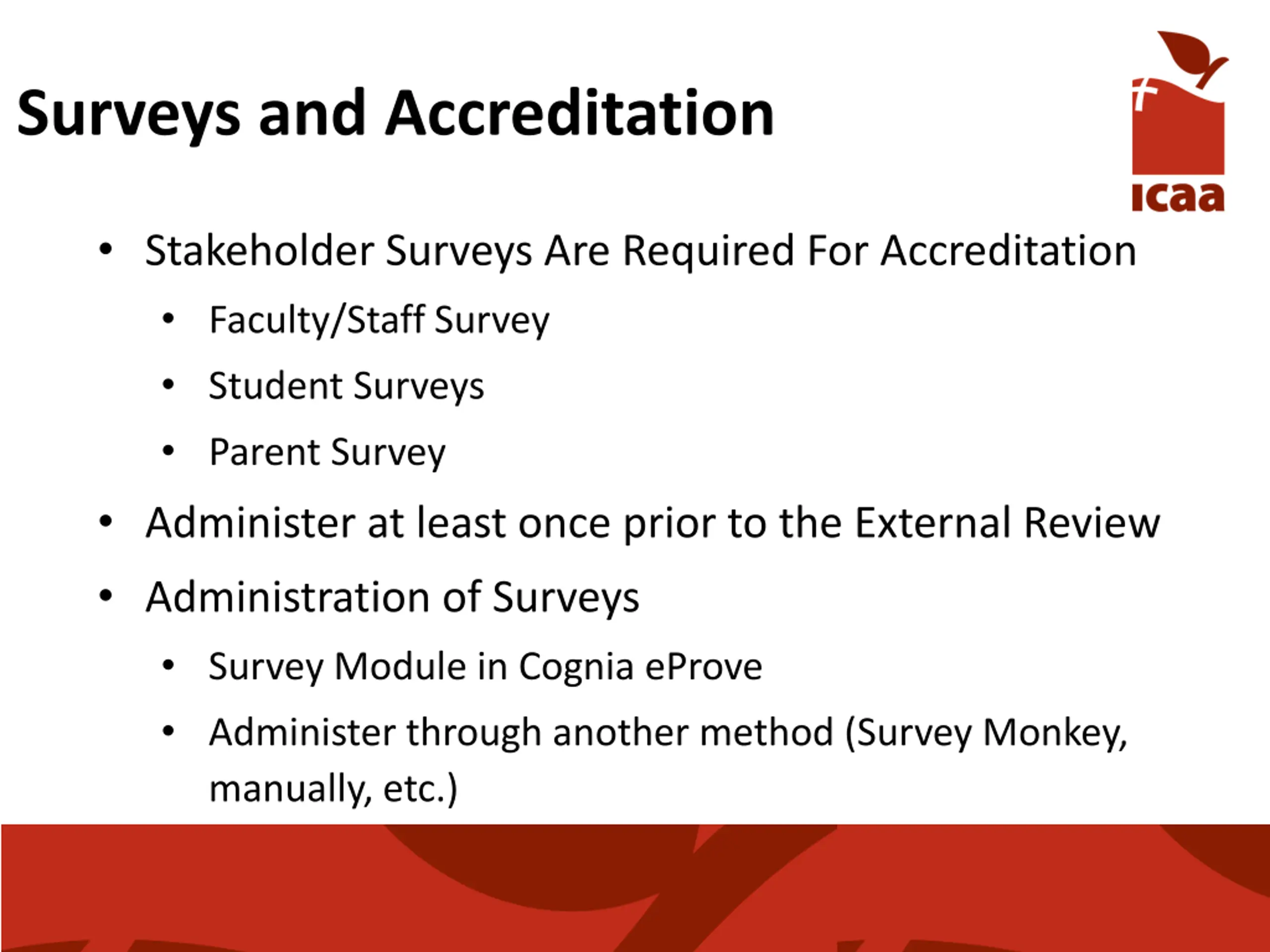Surveys and Accreditation Stakeholder Surveys Are Required For Accreditation Faculty/Staff Survey Student Surveys Parent Survey Administer at least once prior to the External Review Administration of Surveys Survey Module in Cognia eProve Administer through another method (Survey Monkey, manually, etc.)