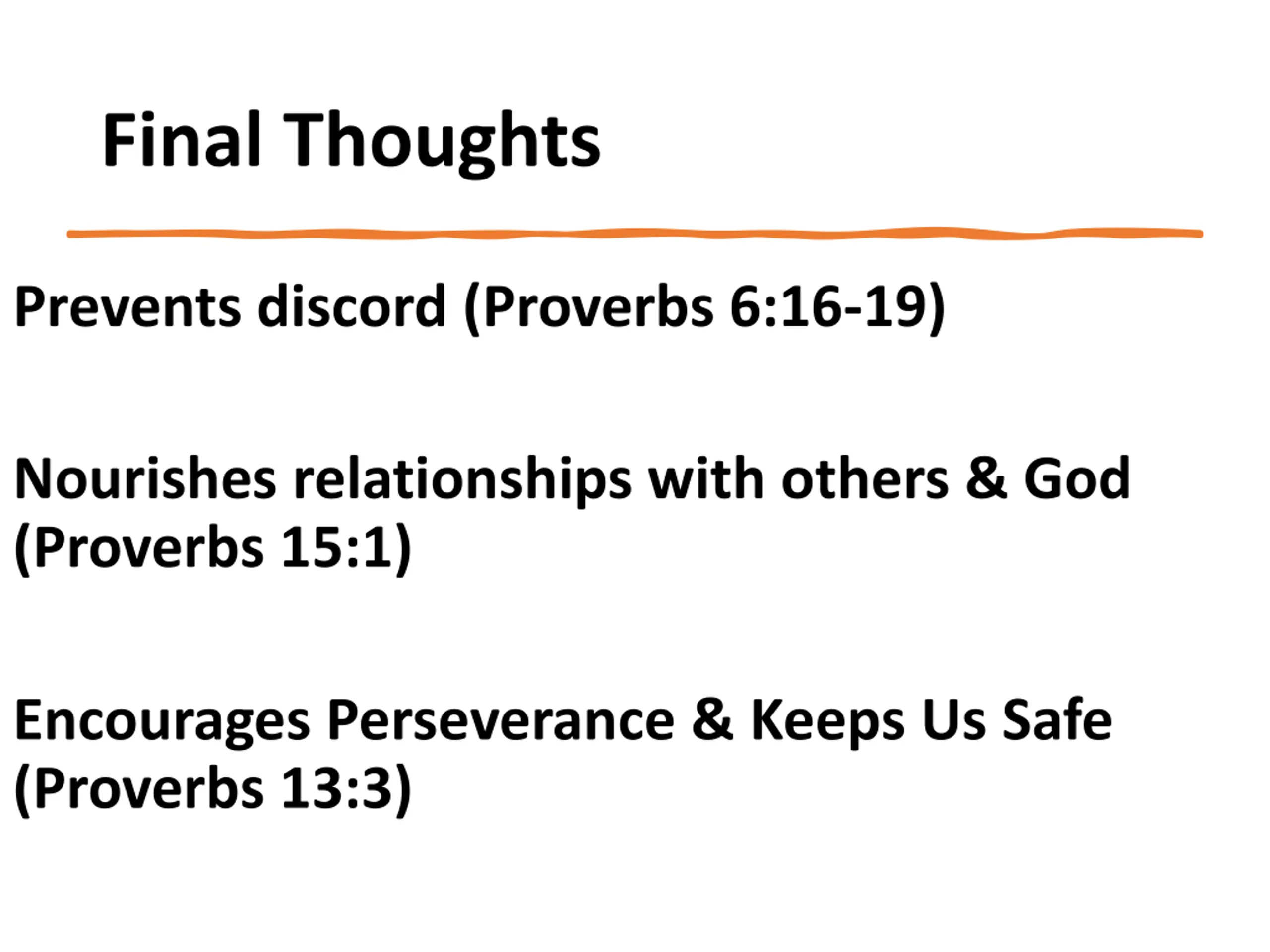Final Thoughts Prevents discord (Proverbs 6:16-19) Nourishes relationships with others & God (Proverbs 15:1) Encourages Perseverance & Keeps Us Safe (Proverbs 13:3)