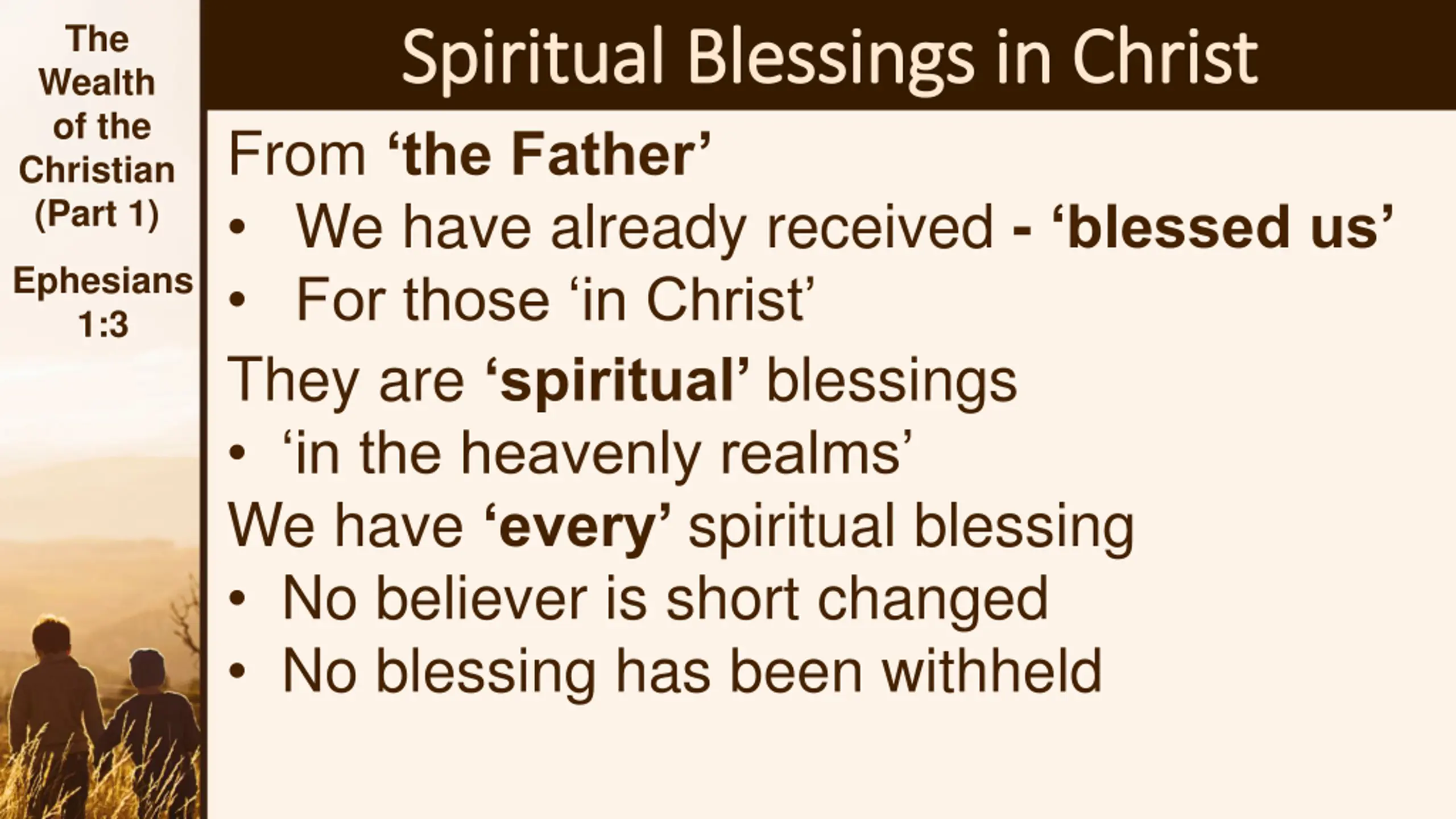 The Wealth of the Christian (Part 1) Spiritual Blessings in Christ Spiritual Blessings in Christ From the Father We have already received - blessed us For those in Christ They are spiritual blessings in the heavenly realms We have every spiritual blessing No believer is short changed No blessing has been withheld Ephesians 1:3