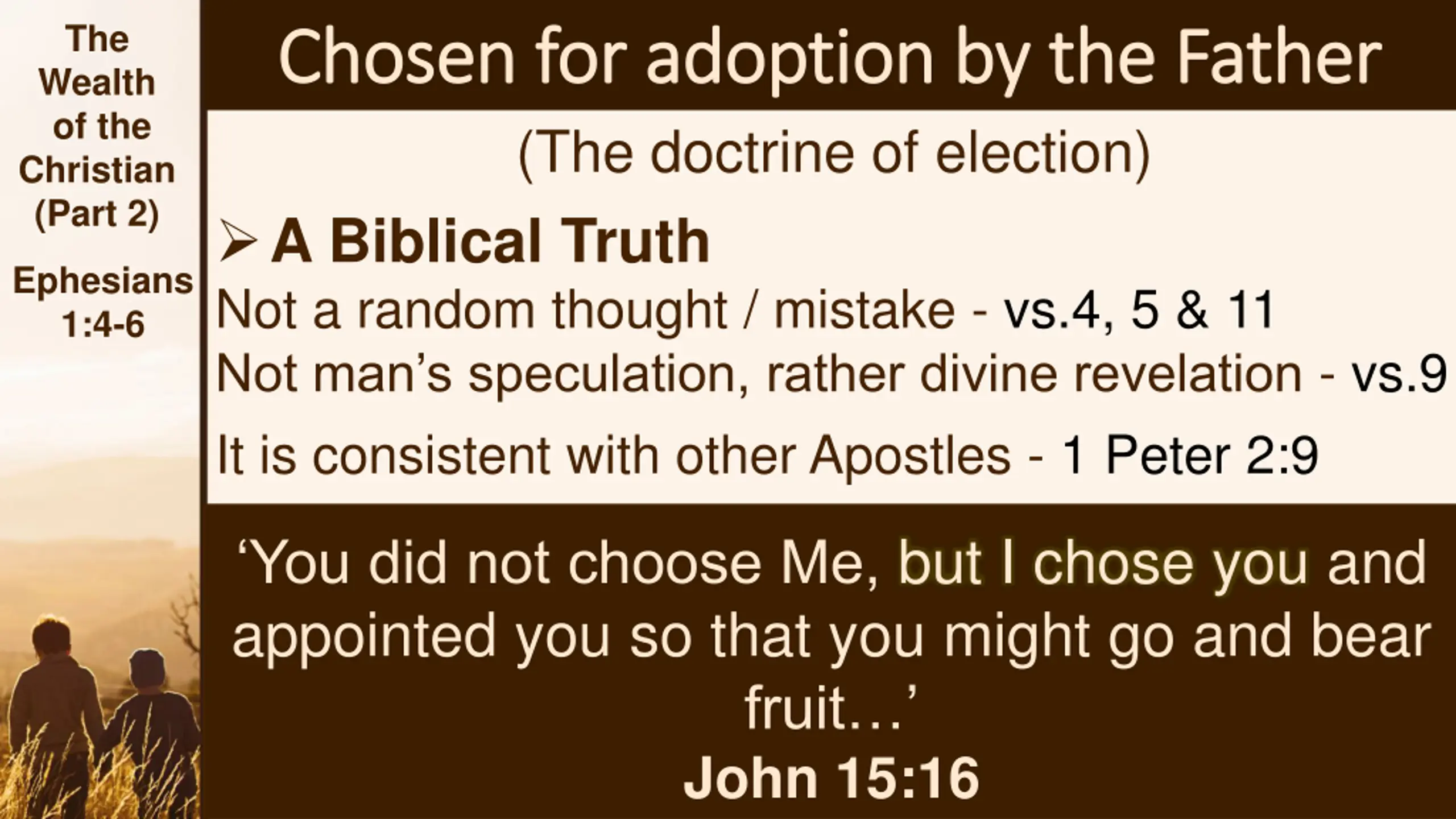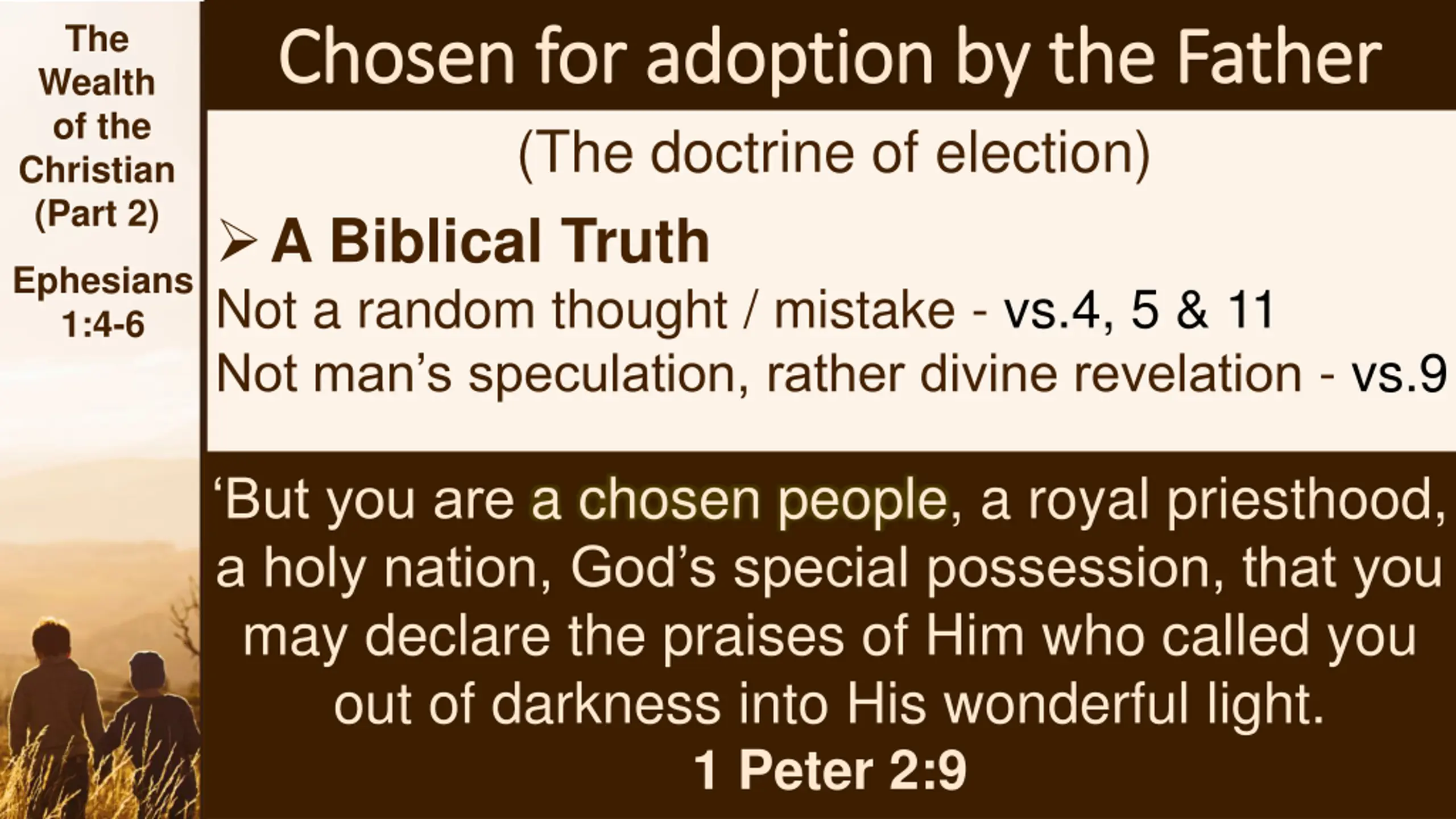 The Wealth of the Christian (Part 2) Chosen for adoption by the Father Chosen for adoption by the Father (The doctrine of election) A Biblical Truth Not a random thought / mistake - vs.4, 5 & 11 Not man s speculation, rather divine revelation - vs.9 It is consistent with other Apostles - 1 Peter 2:9 Ephesians 1:4-6 You did not choose Me, but I chose you and appointed you so that you might go and bear fruit John 15:16