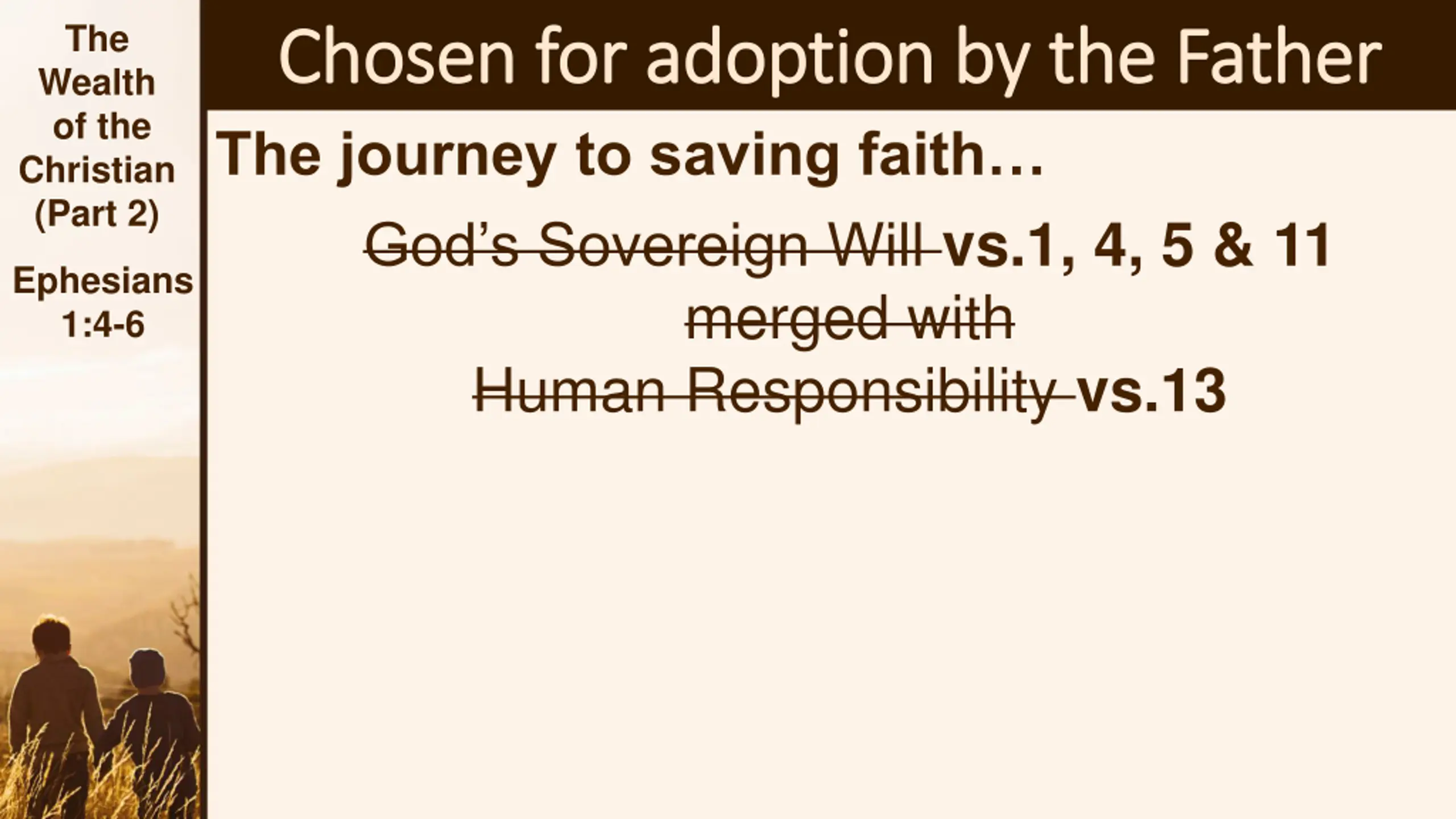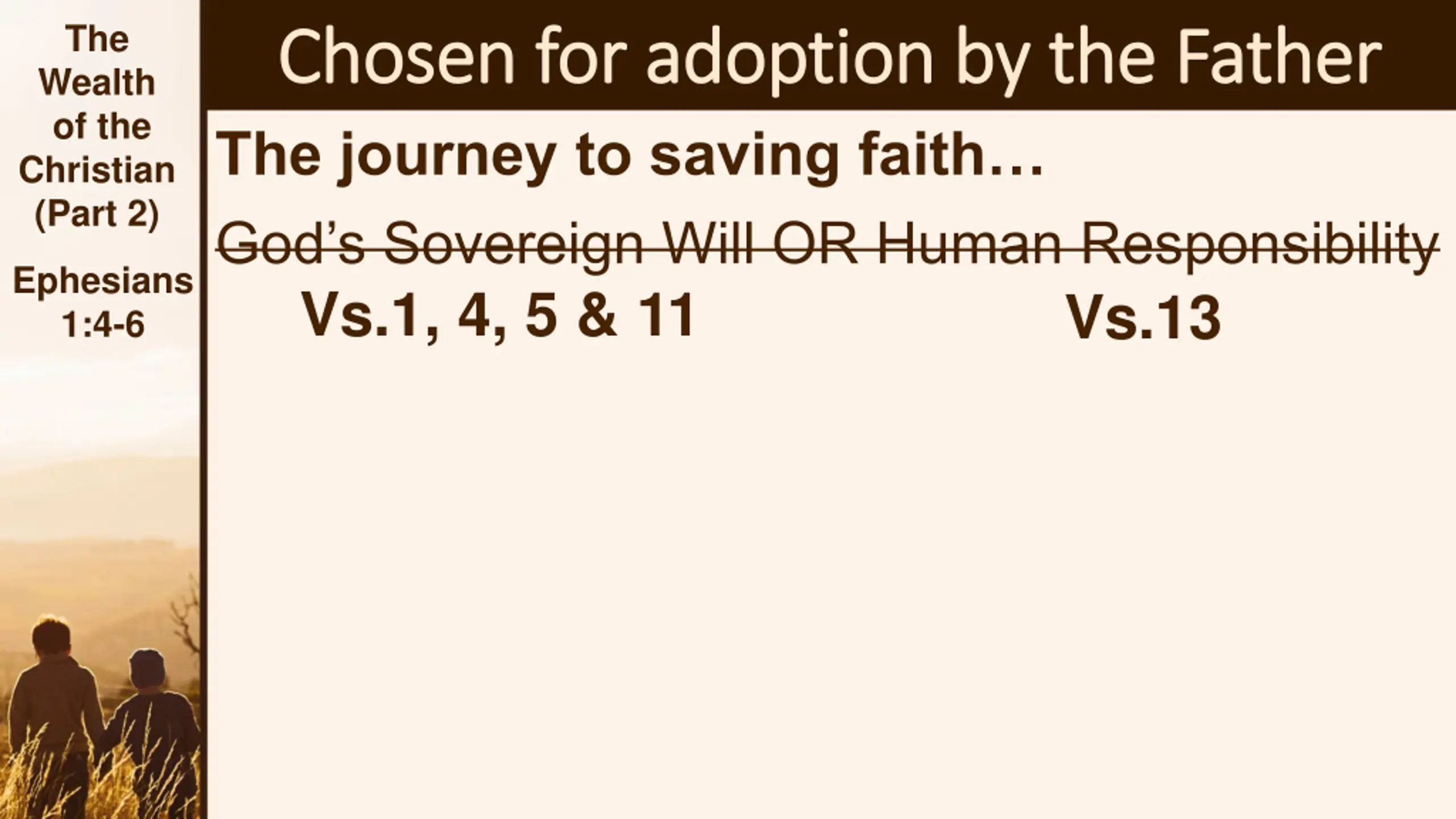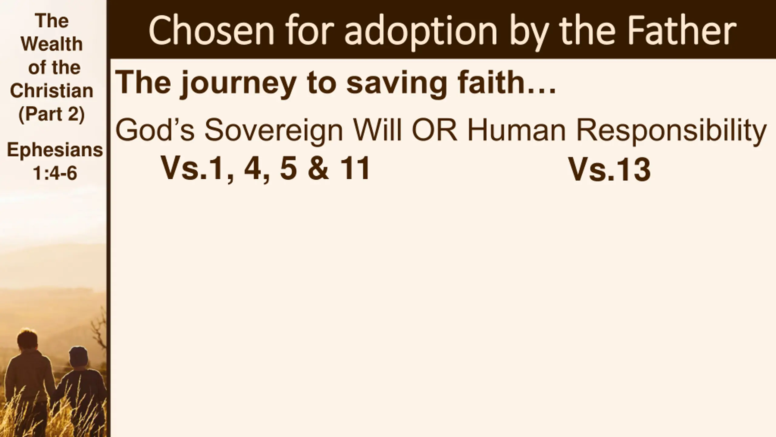 The Wealth of the Christian (Part 2) Chosen for adoption by the Father Chosen for adoption by the Father The journey to saving faith God s Sovereign Will OR Human Responsibility Vs.1, 4, 5 & 11 Ephesians 1:4-6 Vs.13