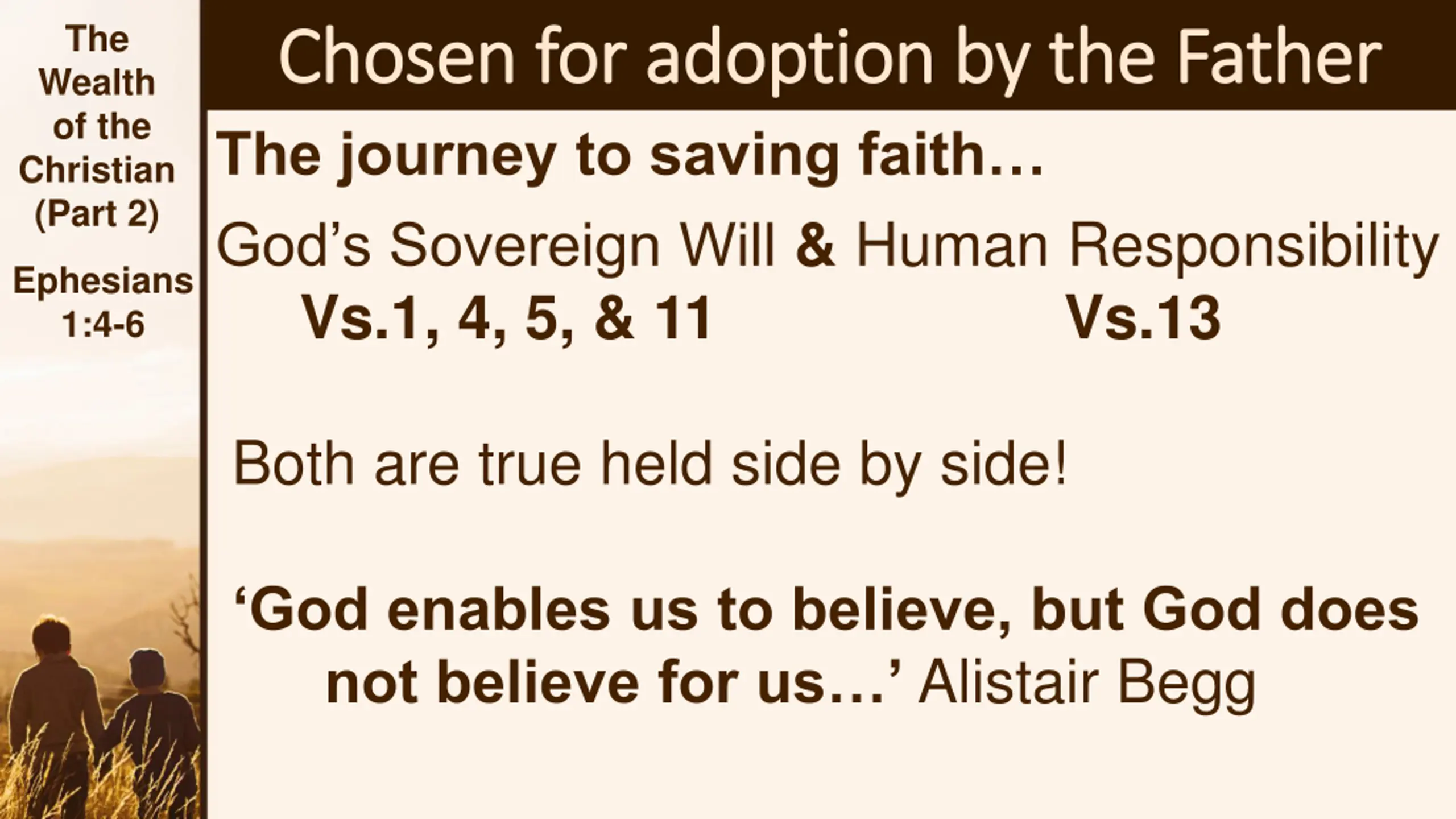 The Wealth of the Christian (Part 2) Chosen for adoption by the Father Chosen for adoption by the Father The journey to saving faith God s Sovereign Will & Human Responsibility Vs.1, 4, 5, & 11 Ephesians 1:4-6 Vs.13 Both are true held side by side! God enables us to believe, but God does not believe for us Alistair Begg
