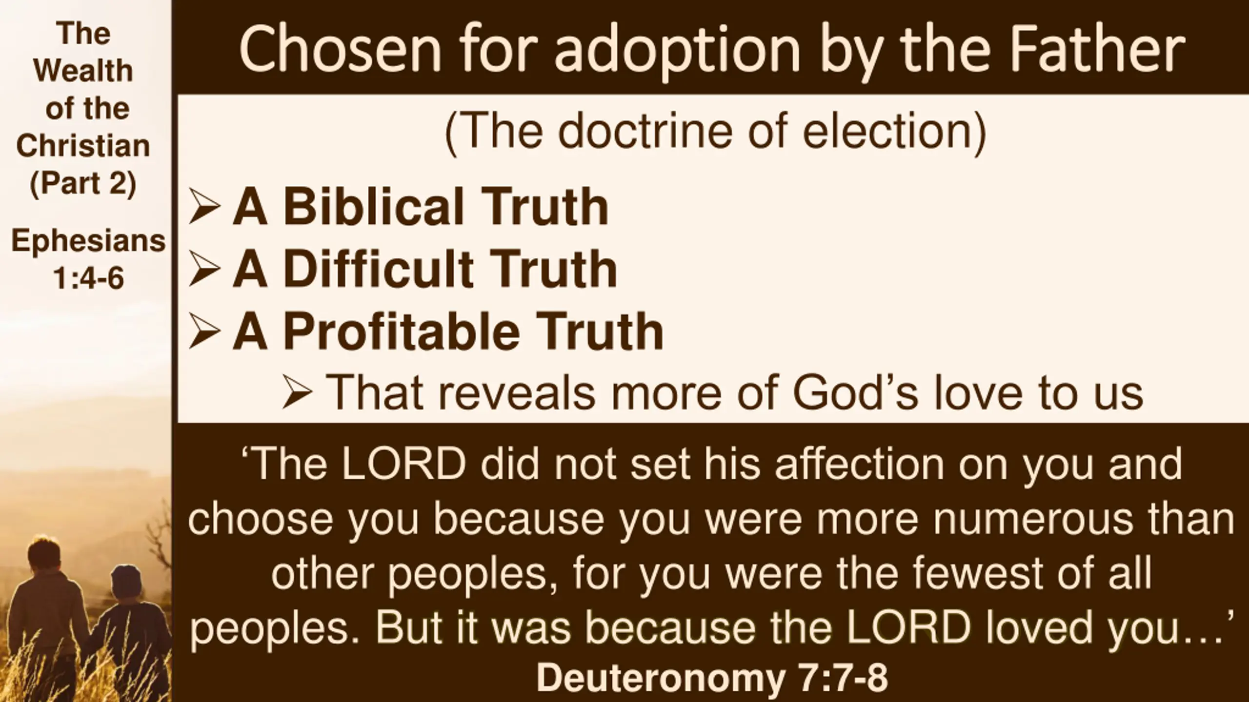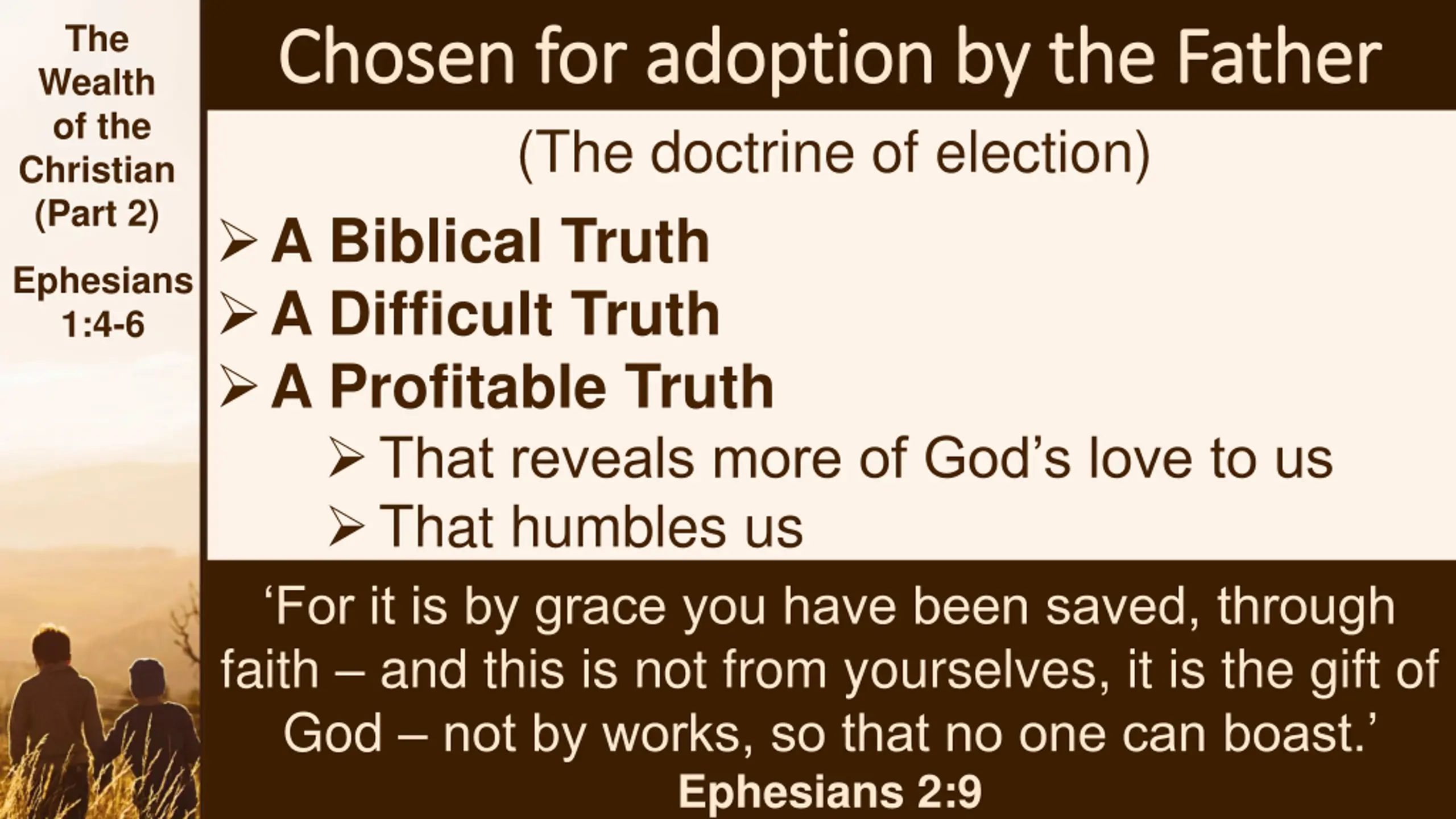 The Wealth of the Christian (Part 2) Chosen for adoption by the Father Chosen for adoption by the Father (The doctrine of election) A Biblical Truth A Difficult Truth We often find election hard to swallow because we don t really think that those who aren t chosen deserve God s judgement (which usually reveals that we don t really think that we deserve judgement either). Richard Coekin Ephesians 1:4-6