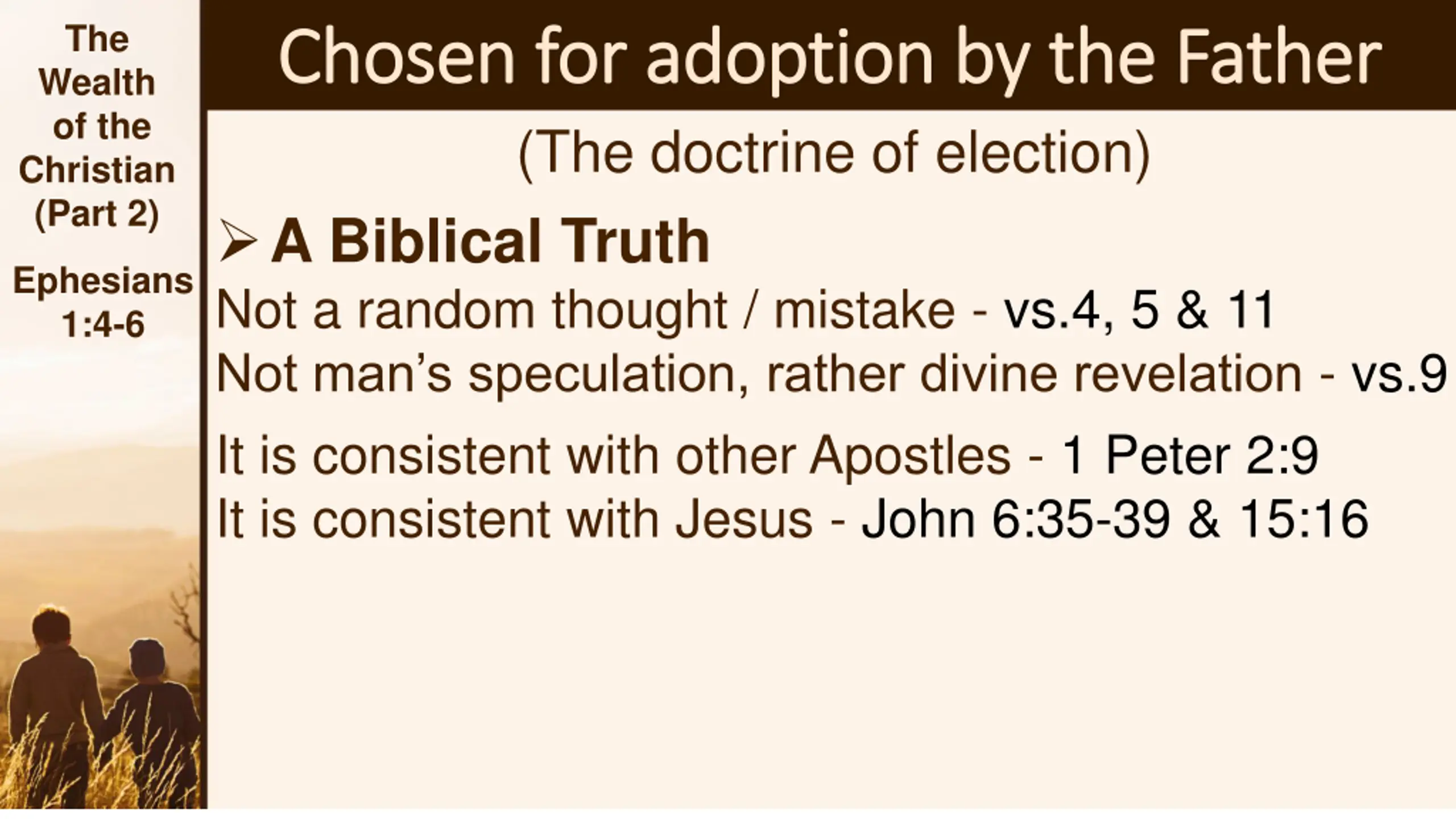 The Wealth of the Christian (Part 2) Chosen for adoption by the Father Chosen for adoption by the Father (The doctrine of election) A Biblical Truth Not a random thought / mistake - vs.4, 5 & 11 Not man s speculation, rather divine revelation - vs.9 It is consistent with other Apostles - 1 Peter 2:9 It is consistent with Jesus - John 6:35-39 & 15:16 Ephesians 1:4-6