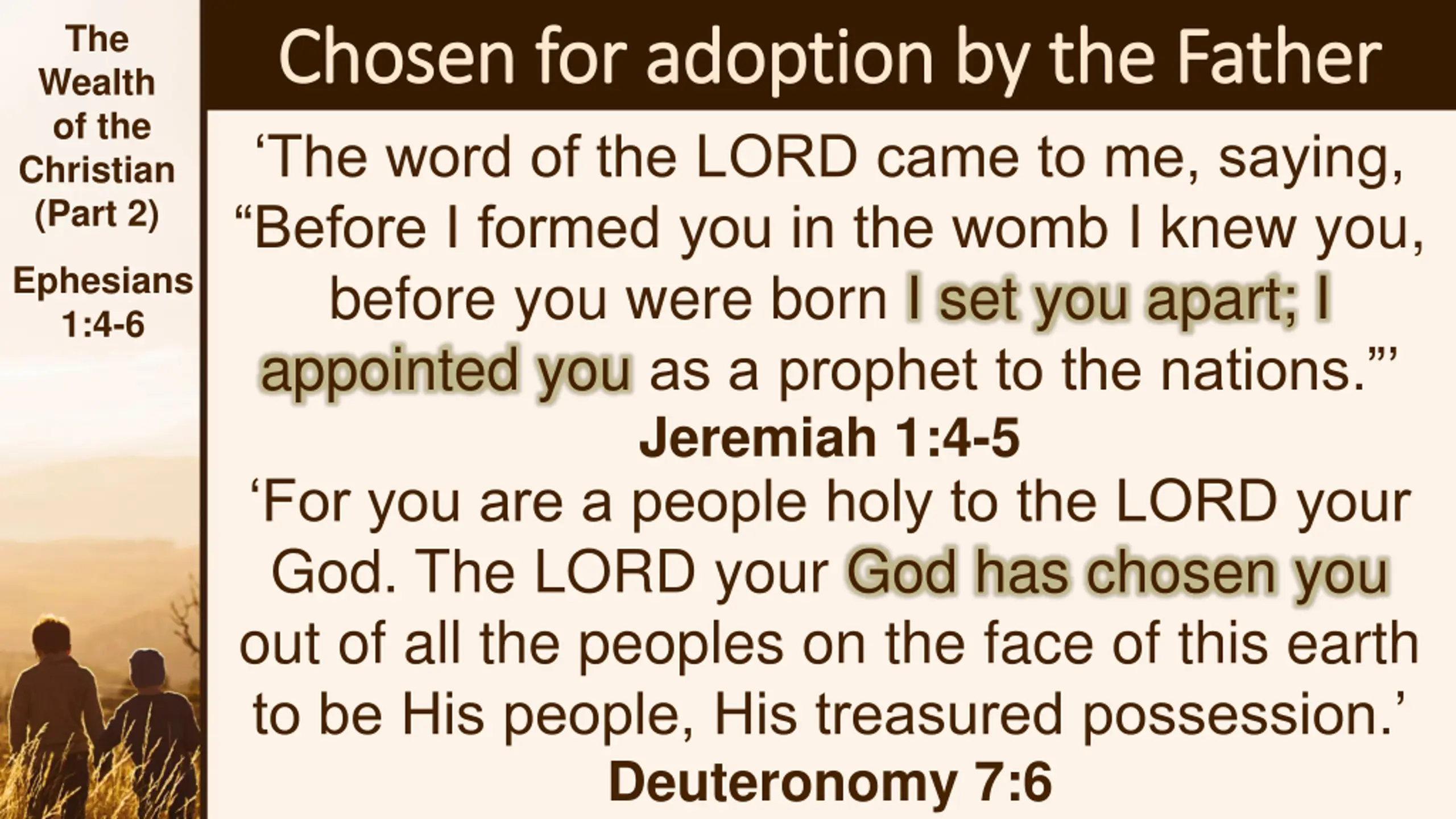The Wealth of the Christian (Part 2) Chosen for adoption by the Father Chosen for adoption by the Father The word of the LORD came to me, saying, Before I formed you in the womb I knew you, before you were born I set you apart; I appointed you as a prophet to the nations. Jeremiah 1:4-5 For you are a people holy to the LORD your God. The LORD your God has chosen you out of all the peoples on the face of this earth to be His people, His treasured possession. Deuteronomy 7:6 Ephesians 1:4-6