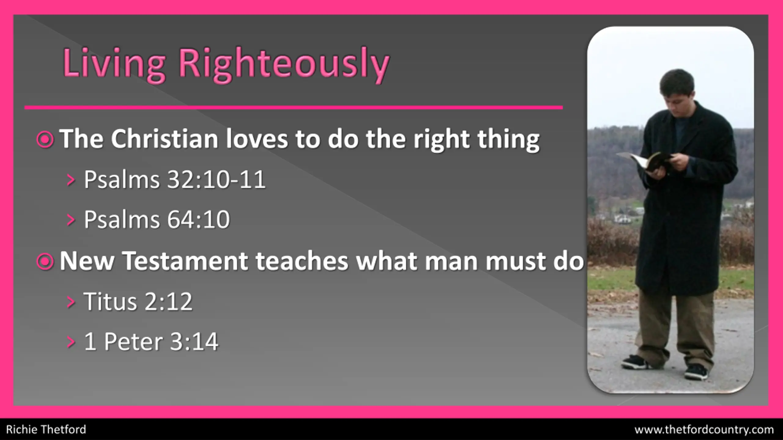 The Christian loves to do the right thing Psalms 32:10-11 Psalms 64:10 New Testament teaches what man must do Titus 2:12 1 Peter 3:14 Richie Thetford www.thetfordcountry.com