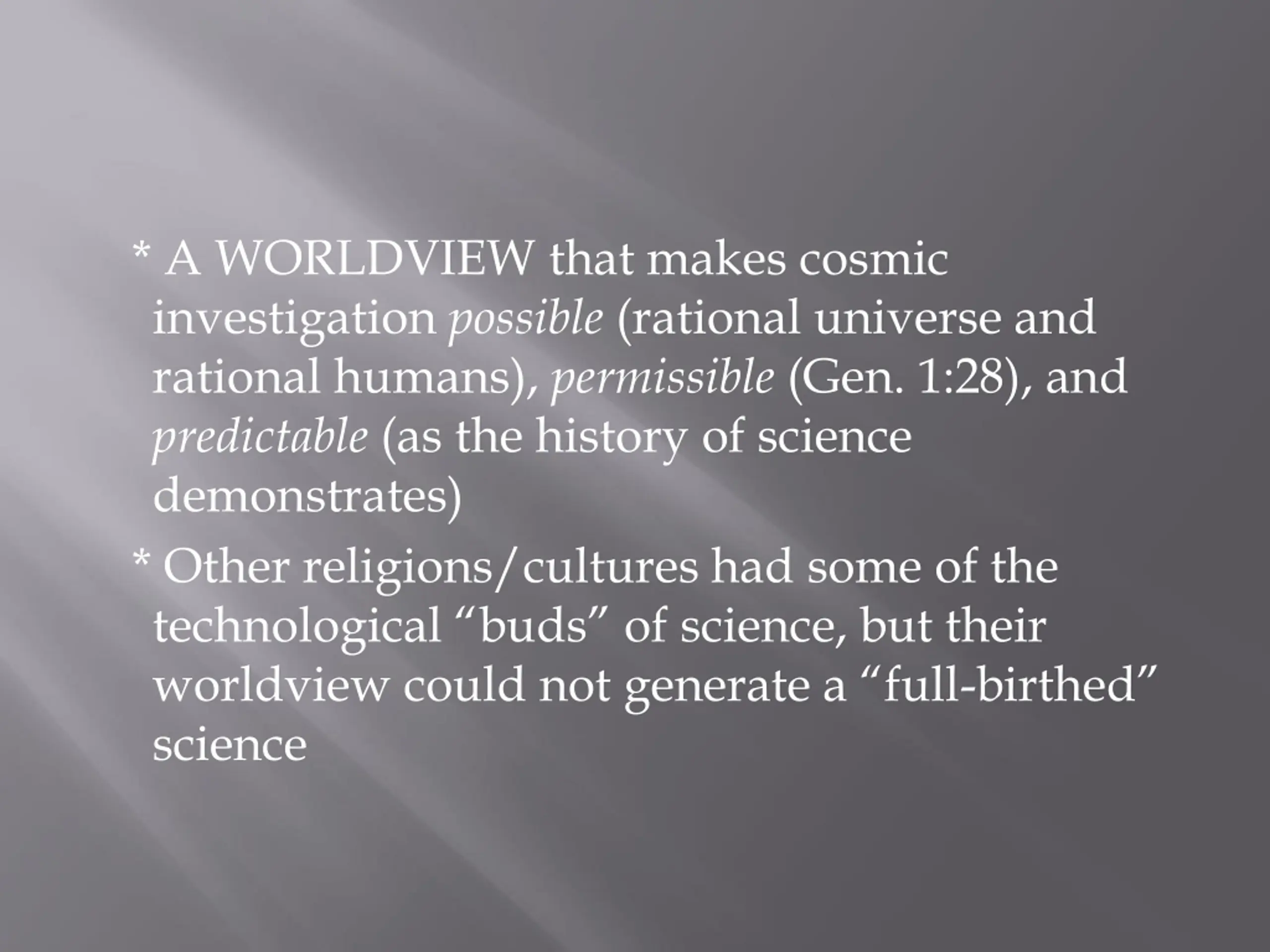 - * A WORLDVIEW that makes cosmic investigation possible (rational universe and rational humans), permissible (Gen. 1:28), and predictable (as the history of science demonstrates) * Other religions/cultures had some of the technological buds of science, but their worldview could not generate a full-birthed science