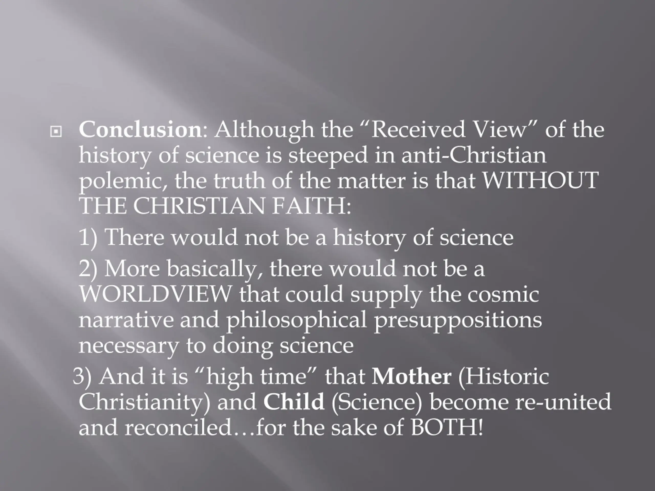 - Conclusion: Although the Received View of the history of science is steeped in anti-Christian polemic, the truth of the matter is that WITHOUT THE CHRISTIAN FAITH: 1) There would not be a history of science 2) More basically, there would not be a WORLDVIEW that could supply the cosmic narrative and philosophical presuppositions necessary to doing science 3) And it is high time that Mother (Historic Christianity) and Child (Science) become re-united and reconciled for the sake of BOTH!
