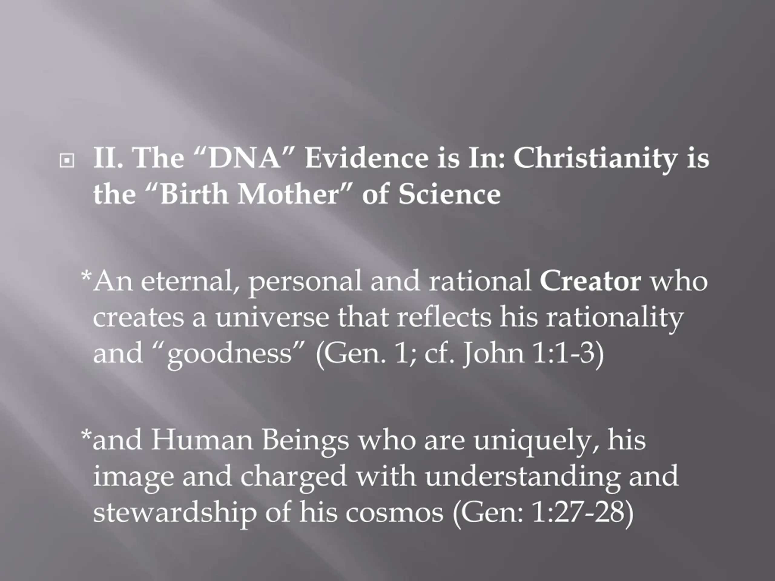 - II. The DNA Evidence is In: Christianity is the Birth Mother of Science *An eternal, personal and rational Creator who creates a universe that reflects his rationality and goodness (Gen. 1; cf. John 1:1-3) *and Human Beings who are uniquely, his image and charged with understanding and stewardship of his cosmos (Gen: 1:27-28)