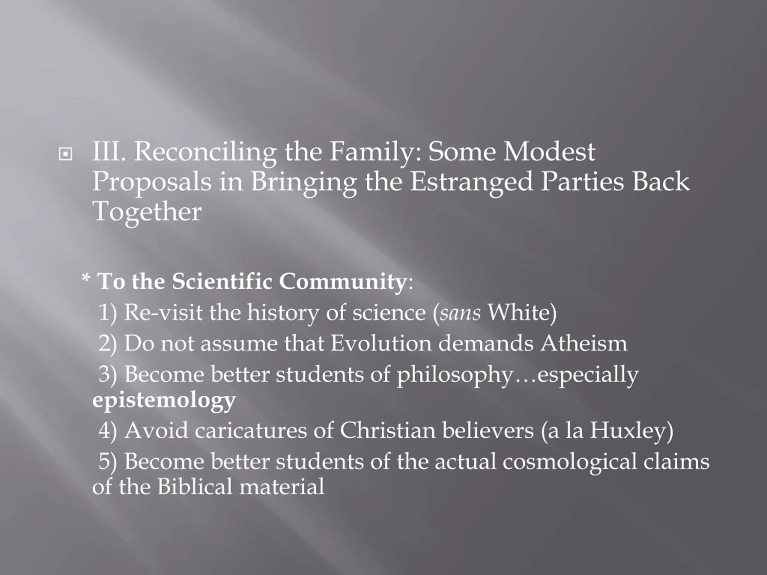 - III. Reconciling the Family: Some Modest Proposals in Bringing the Estranged Parties Back Together * To the Scientific Community: 1) Re-visit the history of science (sans White) 2) Do not assume that Evolution demands Atheism 3) Become better students of philosophy especially epistemology 4) Avoid caricatures of Christian believers (a la Huxley) 5) Become better students of the actual cosmological claims of the Biblical material