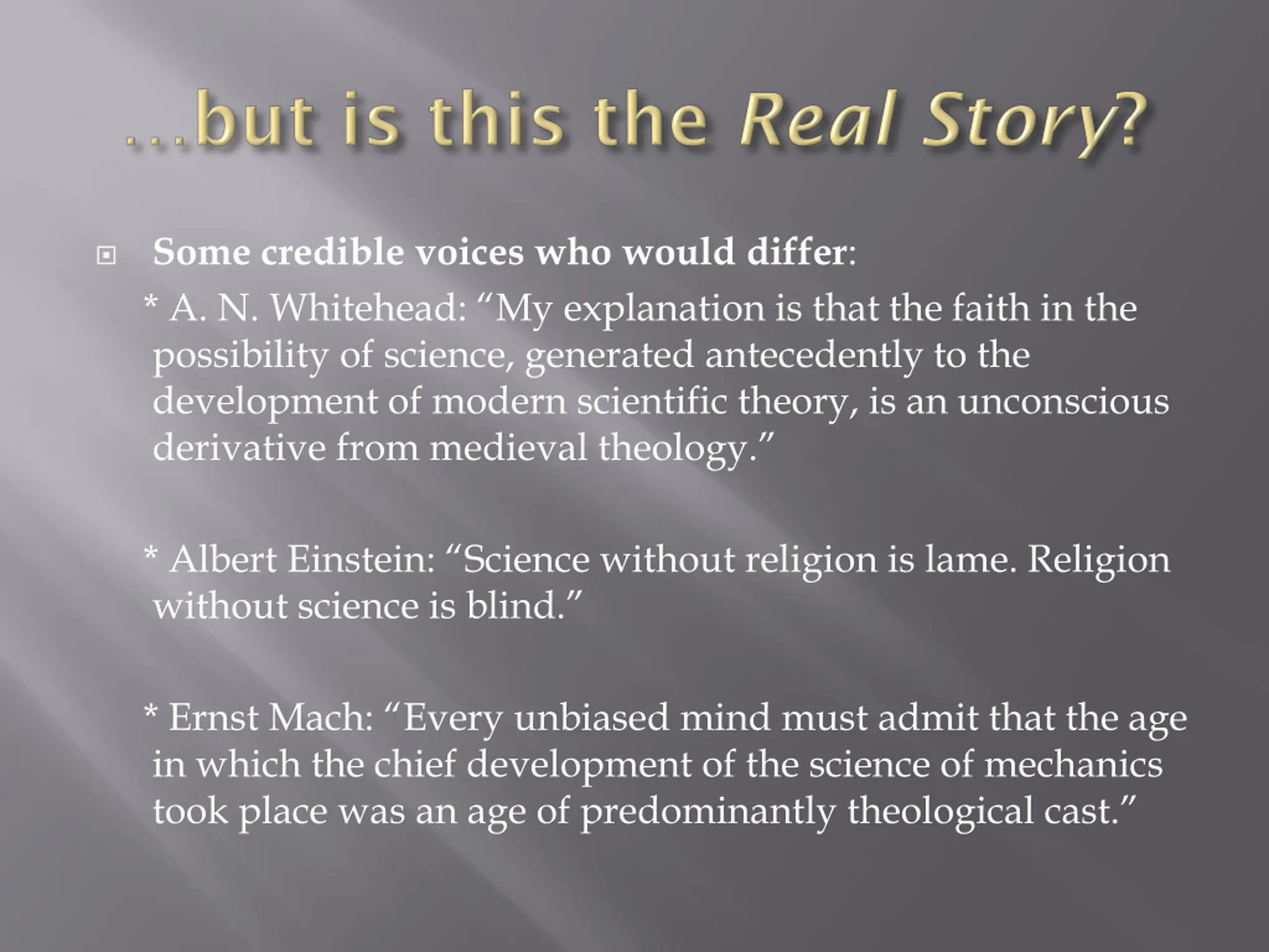 - Some credible voices who would differ: * A. N. Whitehead: My explanation is that the faith in the possibility of science, generated antecedently to the development of modern scientific theory, is an unconscious derivative from medieval theology. * Albert Einstein: Science without religion is lame. Religion without science is blind. * Ernst Mach: Every unbiased mind must admit that the age in which the chief development of the science of mechanics took place was an age of predominantly theological cast.