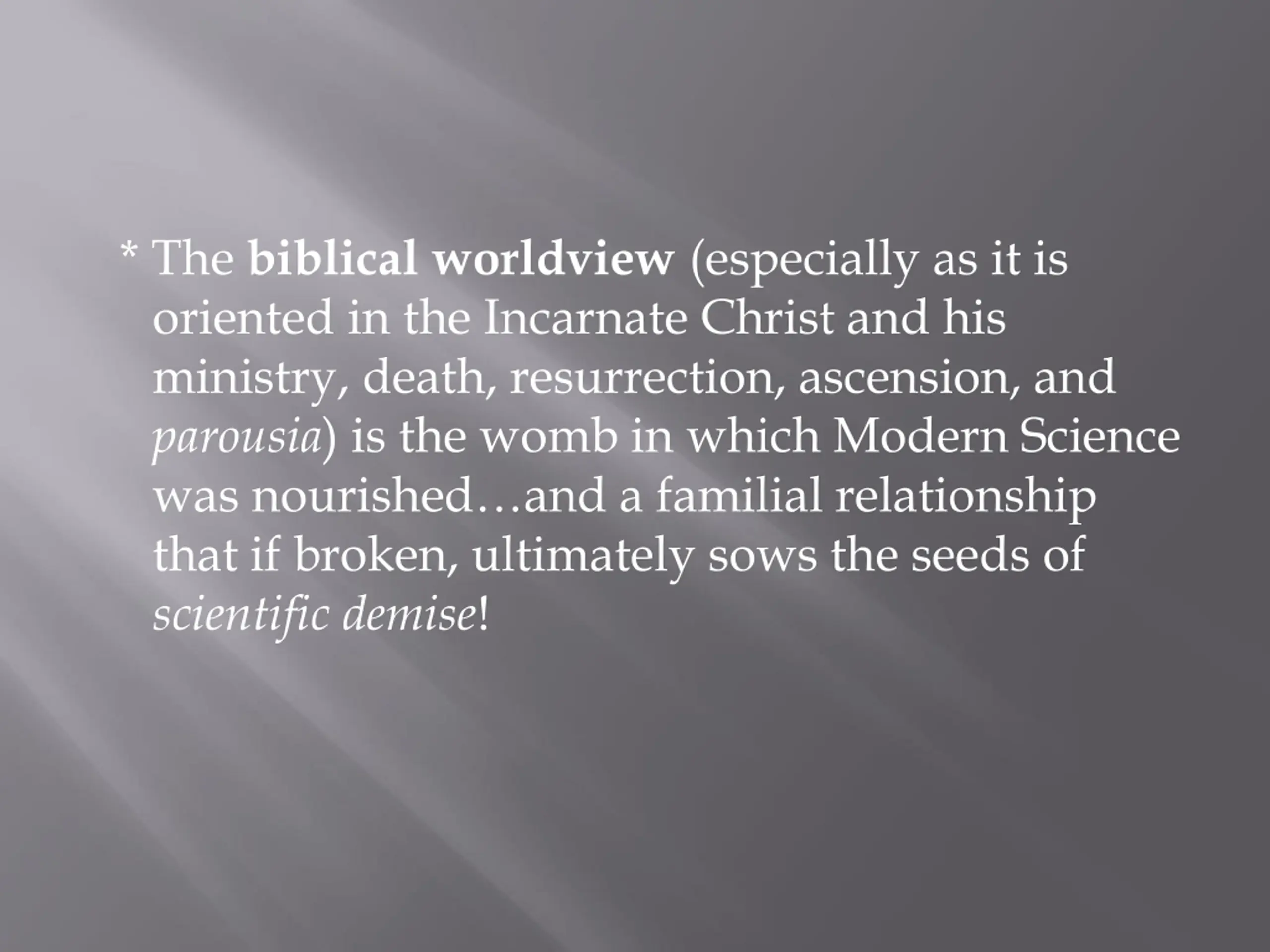 - * The biblical worldview (especially as it is oriented in the Incarnate Christ and his ministry, death, resurrection, ascension, and parousia) is the womb in which Modern Science was nourished and a familial relationship that if broken, ultimately sows the seeds of scientific demise!