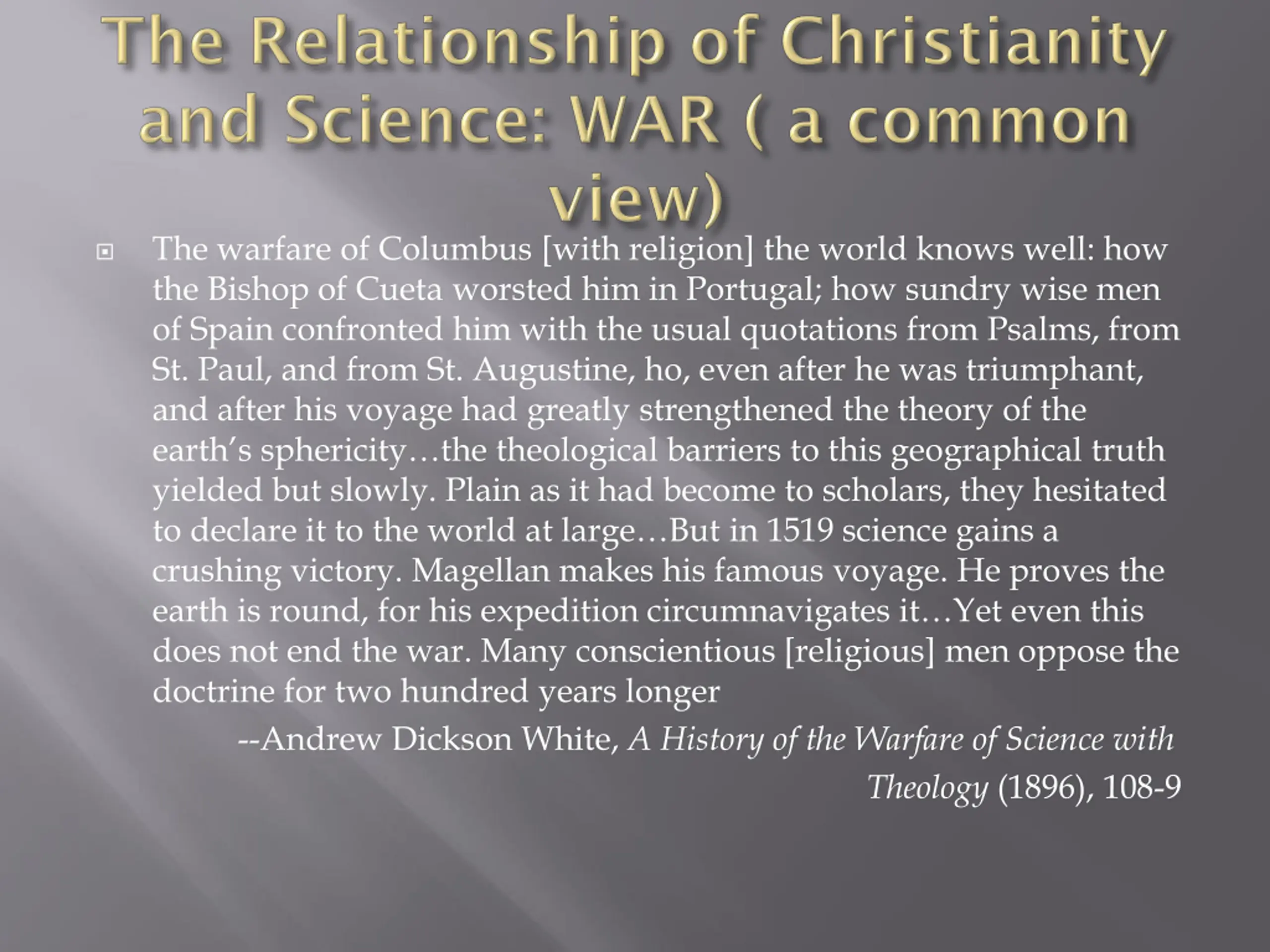 - The warfare of Columbus [with religion] the world knows well: how the Bishop of Cueta worsted him in Portugal; how sundry wise men of Spain confronted him with the usual quotations from Psalms, from St. Paul, and from St. Augustine, ho, even after he was triumphant, and after his voyage had greatly strengthened the theory of the earth s sphericity the theological barriers to this geographical truth yielded but slowly. Plain as it had become to scholars, they hesitated to declare it to the world at large But in 1519 science gains a crushing victory. Magellan makes his famous voyage. He proves the earth is round, for his expedition circumnavigates it Yet even this does not end the war. Many conscientious [religious] men oppose the doctrine for two hundred years longer --Andrew Dickson White, A History of the Warfare of Science with Theology (1896), 108-9