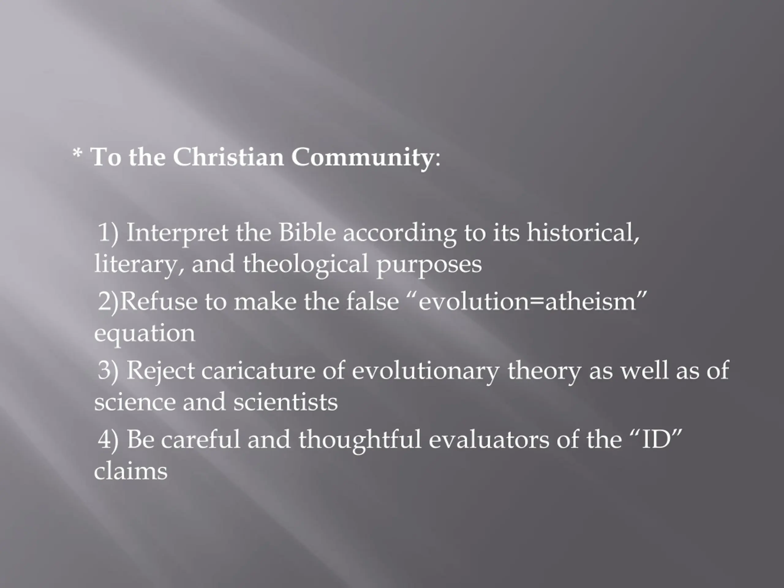 - * To the Christian Community: 1) Interpret the Bible according to its historical, literary, and theological purposes 2)Refuse to make the false evolution=atheism equation 3) Reject caricature of evolutionary theory as well as of science and scientists 4) Be careful and thoughtful evaluators of the ID claims