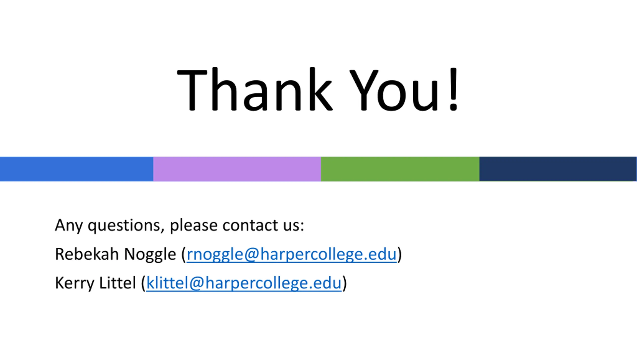 Thank You! Any questions, please contact us: Rebekah Noggle (rnoggle@harpercollege.edu) Kerry Littel (klittel@harpercollege.edu)