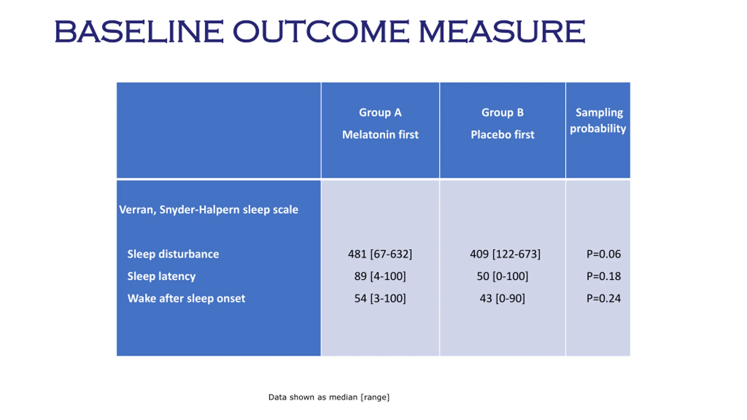 BASELINE OUTCOME MEASURE BASELINE OUTCOME MEASURE Group A Group B Sampling probability Melatonin first Placebo first Verran, Snyder-Halpern sleep scale Sleep disturbance 481 [67-632] 409 [122-673] P=0.06 Sleep latency 89 [4-100] 50 [0-100] P=0.18 Wake after sleep onset 54 [3-100] 43 [0-90] P=0.24 Data shown as median [range]