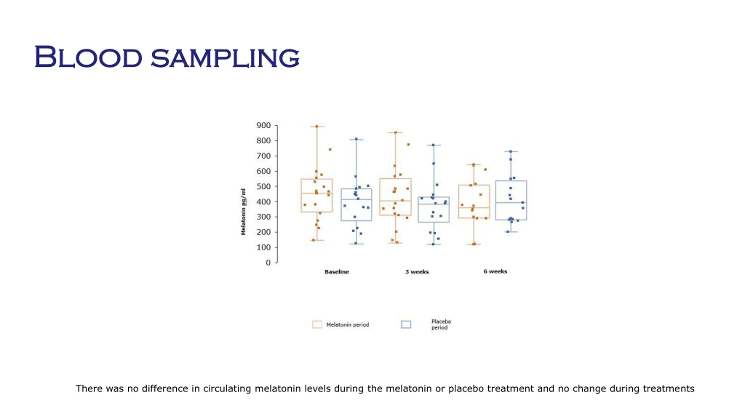 Blood sampling Blood sampling There was no difference in circulating melatonin levels during the melatonin or placebo treatment and no change during treatments
