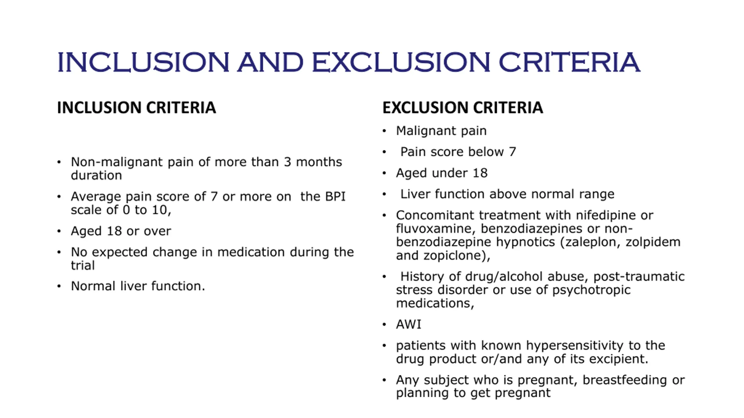 INCLUSION AND EXCLUSION CRITERIA INCLUSION AND EXCLUSION CRITERIA INCLUSION CRITERIA EXCLUSION CRITERIA Malignant pain Pain score below 7 Aged under 18 Liver function above normal range Concomitant treatment with nifedipine or fluvoxamine, benzodiazepines or non- benzodiazepine hypnotics (zaleplon, zolpidem and zopiclone), History of drug/alcohol abuse, post-traumatic stress disorder or use of psychotropic medications, AWI patients with known hypersensitivity to the drug product or/and any of its excipient. Any subject who is pregnant, breastfeeding or planning to get pregnant Non-malignant pain of more than 3 months duration Average pain score of 7 or more on the BPI scale of 0 to 10, Aged 18 or over No expected change in medication during the trial Normal liver function.