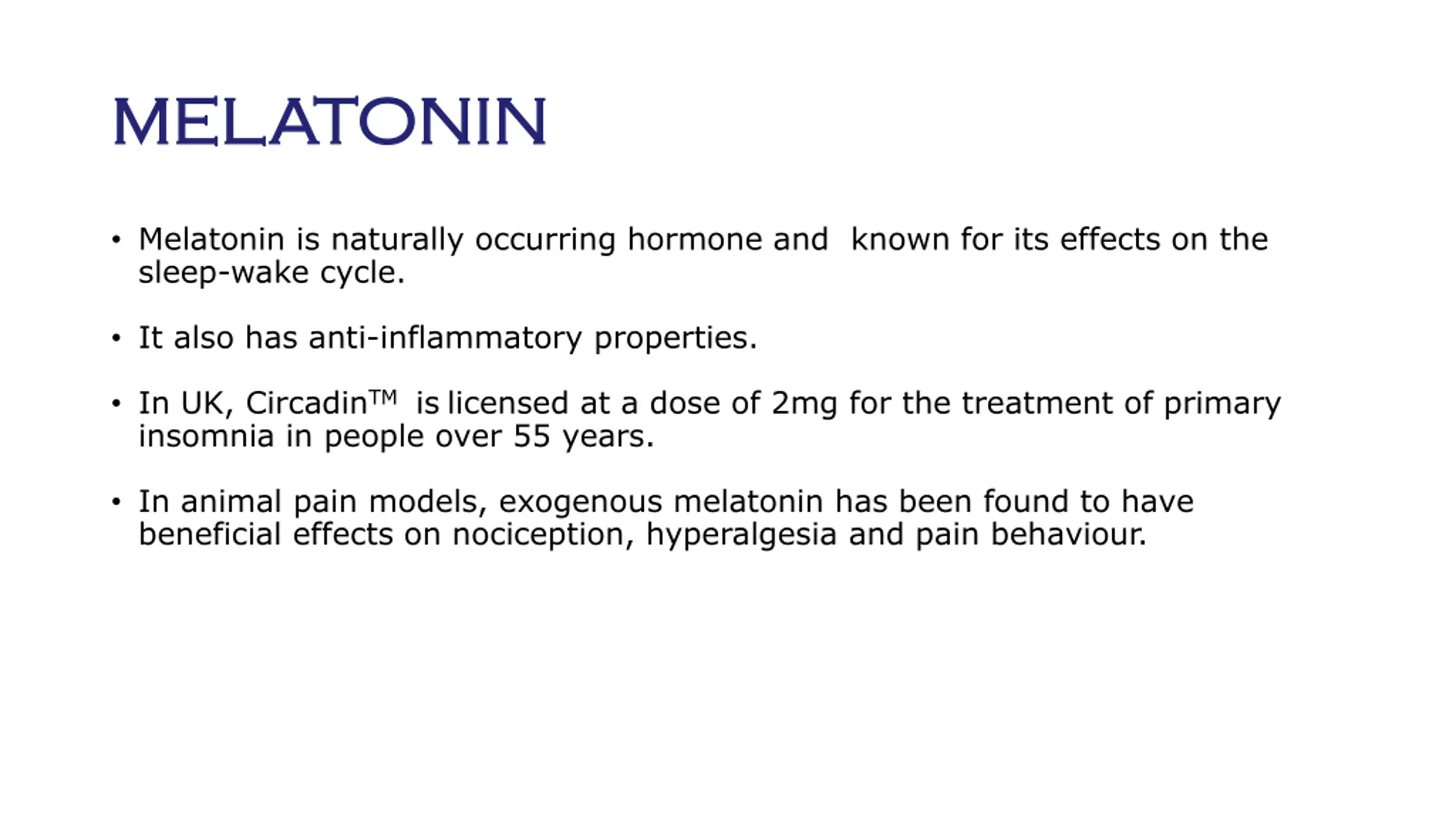 MELATONIN MELATONIN Melatonin is naturally occurring hormone and known for its effects on the sleep-wake cycle. It also has anti-inflammatory properties. In UK, CircadinTM islicensed at a dose of 2mg for the treatment of primary insomnia in people over 55 years. In animal pain models, exogenous melatonin has been found to have beneficial effects on nociception, hyperalgesia and pain behaviour.