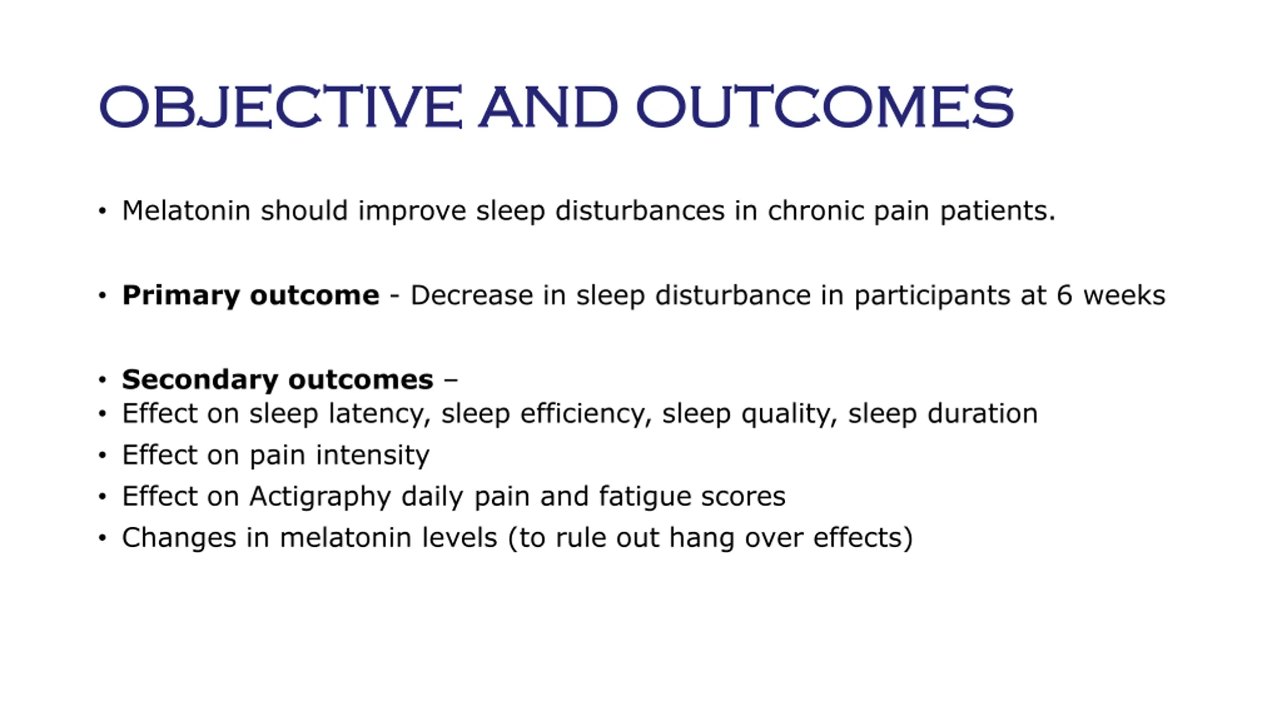 OBJECTIVE AND OUTCOMES OBJECTIVE AND OUTCOMES Melatonin should improve sleep disturbances in chronic pain patients. Primary outcome - Decrease in sleep disturbance in participants at 6 weeks Secondary outcomes Effect on sleep latency, sleep efficiency, sleep quality, sleep duration Effect on pain intensity Effect on Actigraphy daily pain and fatigue scores Changes in melatonin levels (to rule out hang over effects)