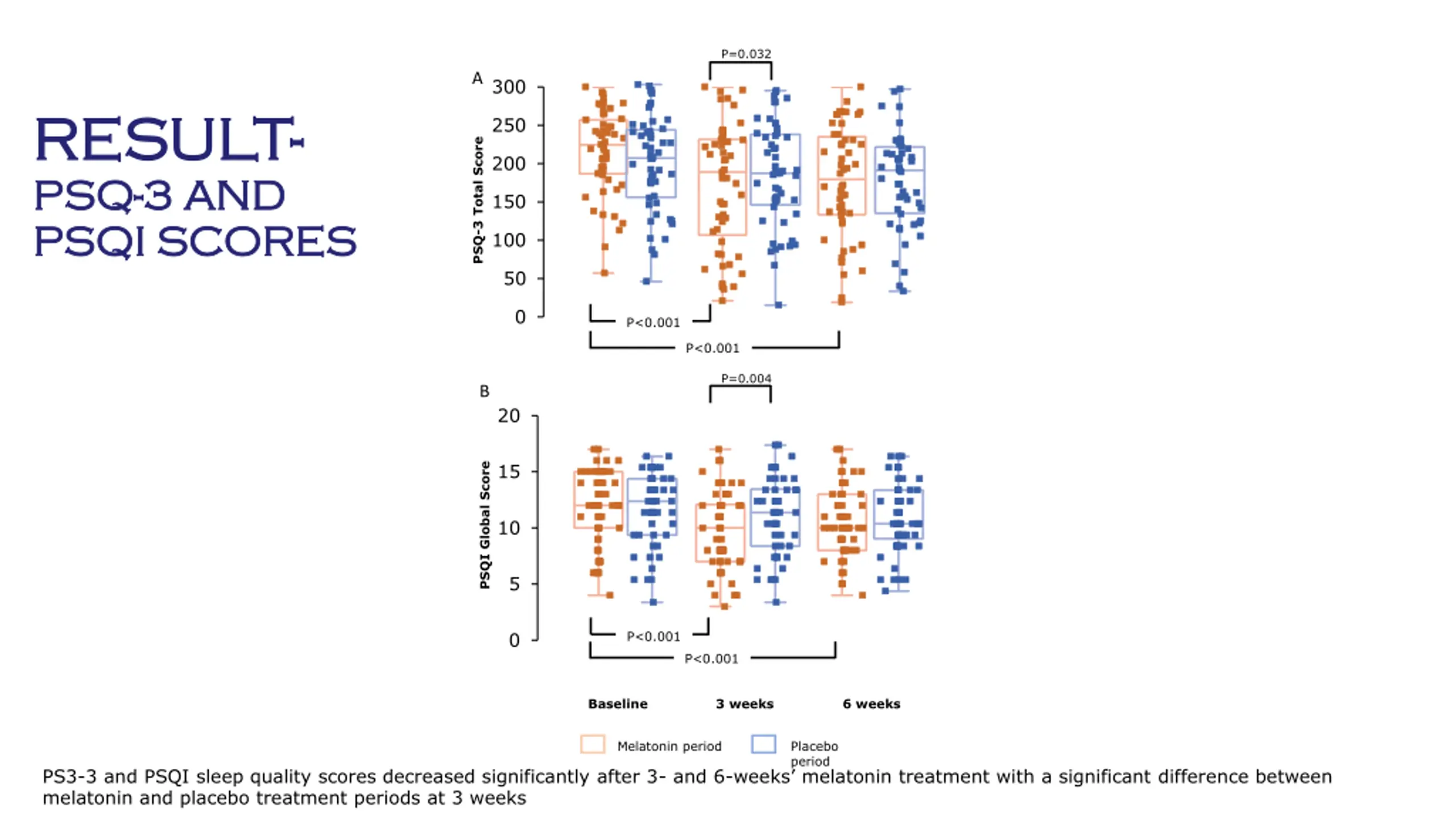 P=0.032 A 300 RESULT RESULT-- PSQ PSQ--3 AND 3 AND PSQI SCORES PSQI SCORES 250 PSQ-3 Total Score 200 150 100 50 0 P<0.001 P<0.001 P=0.004 B 20 15 PSQI Global Score 10 5 0 P<0.001 P<0.001 Baseline 3 weeks 6 weeks Melatonin period Placebo period PS3-3 and PSQI sleep quality scores decreased significantly after 3- and 6-weeks melatonin treatment with a significant difference between melatonin and placebo treatment periods at 3 weeks