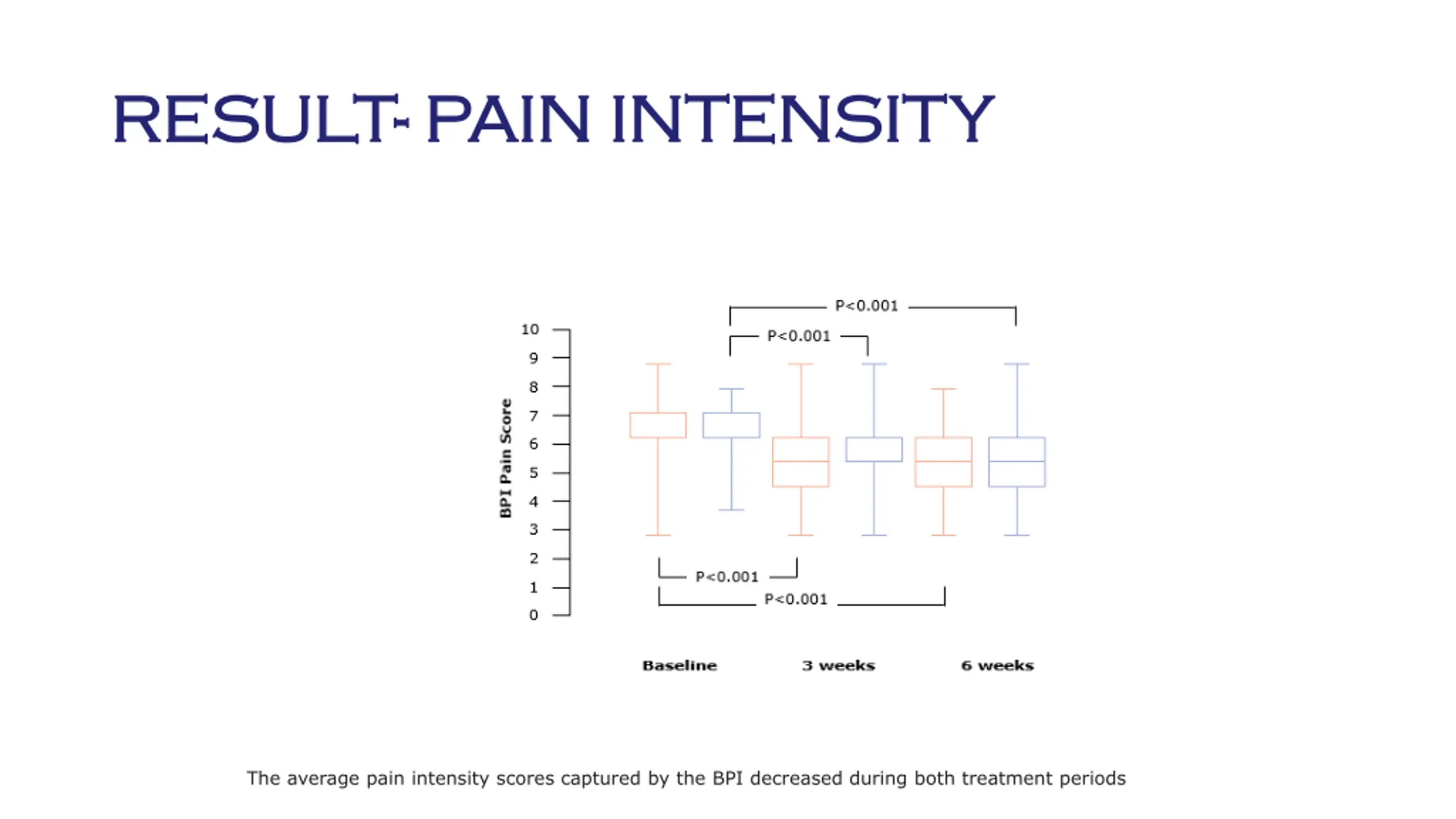 RESULT RESULT-- PAIN INTENSITY PAIN INTENSITY The average pain intensity scores captured by the BPI decreased during both treatment periods