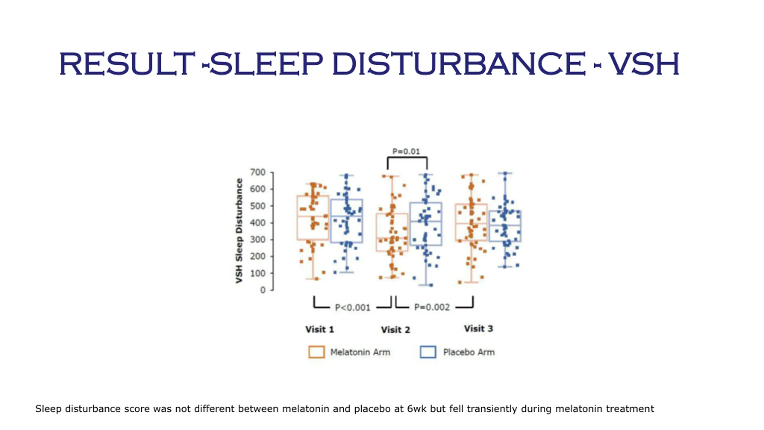 RESULT RESULT --SLEEP DISTURBANCE SLEEP DISTURBANCE -- VSH VSH Sleep disturbance score was not different between melatonin and placebo at 6wk but fell transiently during melatonin treatment