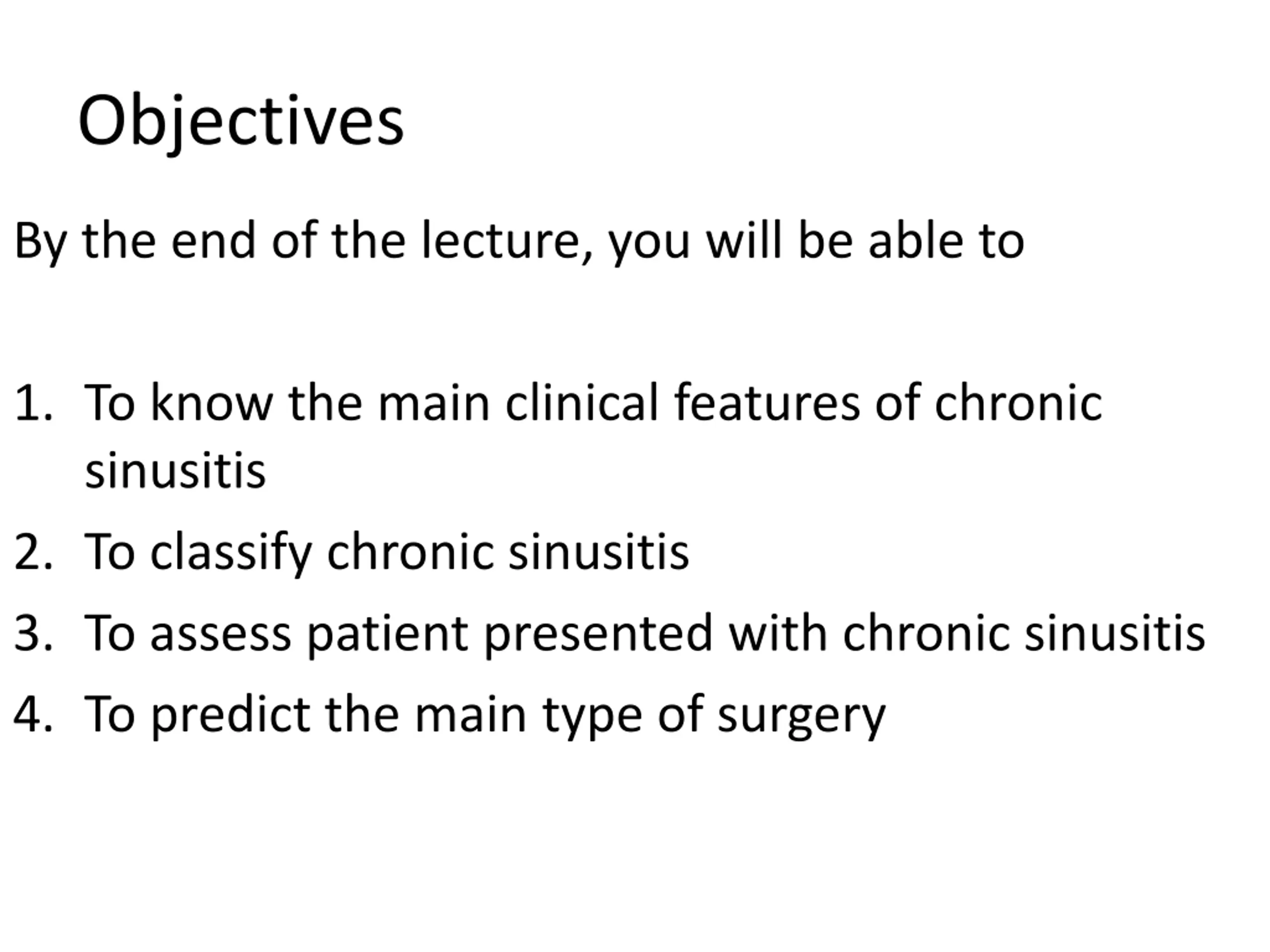 Objectives By the end of the lecture, you will be able to 1. To know the main clinical features of chronic sinusitis 2. To classify chronic sinusitis 3. To assess patient presented with chronic sinusitis 4. To predict the main type of surgery