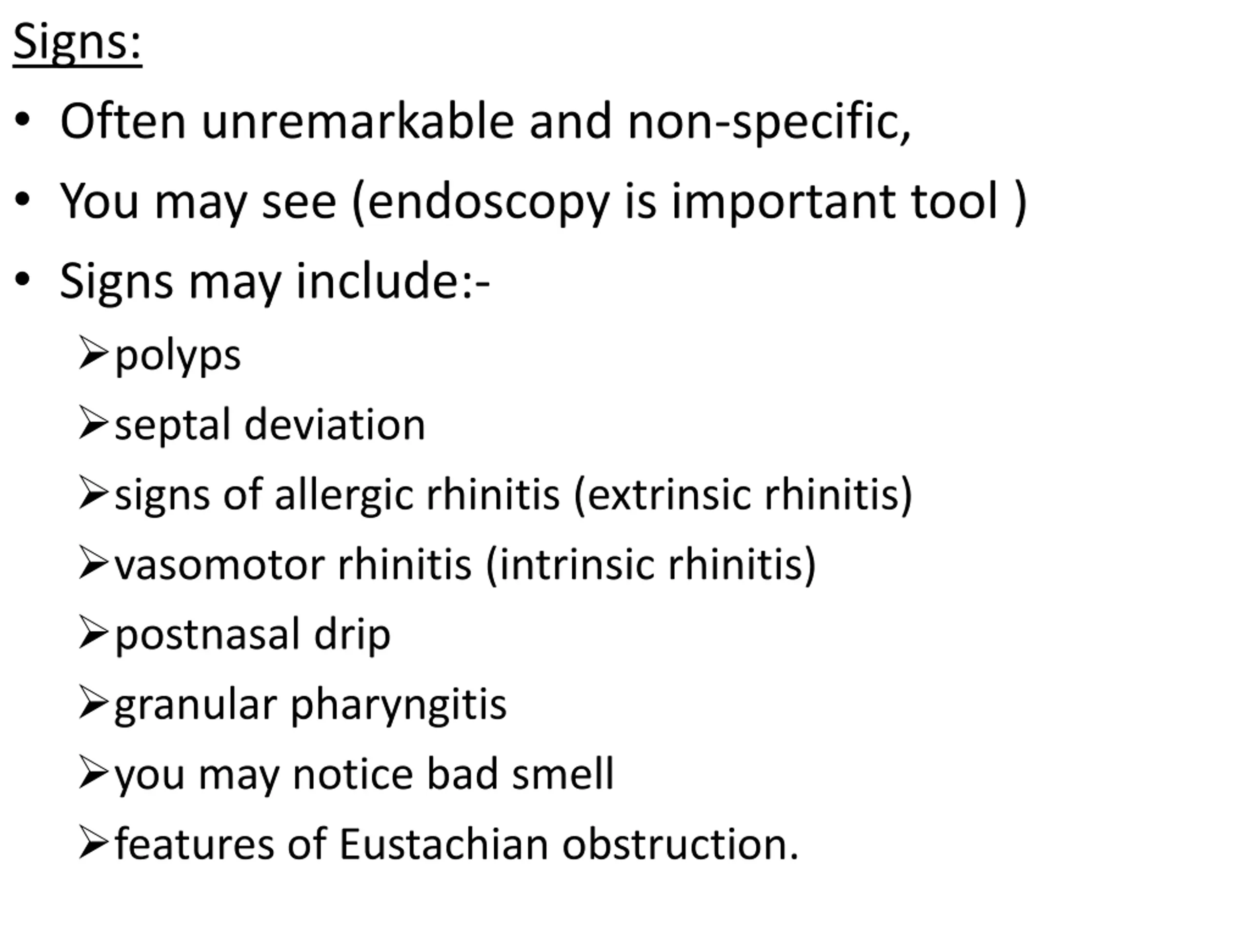 Signs: Often unremarkable and non-specific, You may see (endoscopy is important tool ) Signs may include:- polyps septal deviation signs of allergic rhinitis (extrinsic rhinitis) vasomotor rhinitis (intrinsic rhinitis) postnasal drip granular pharyngitis you may notice bad smell features of Eustachian obstruction.