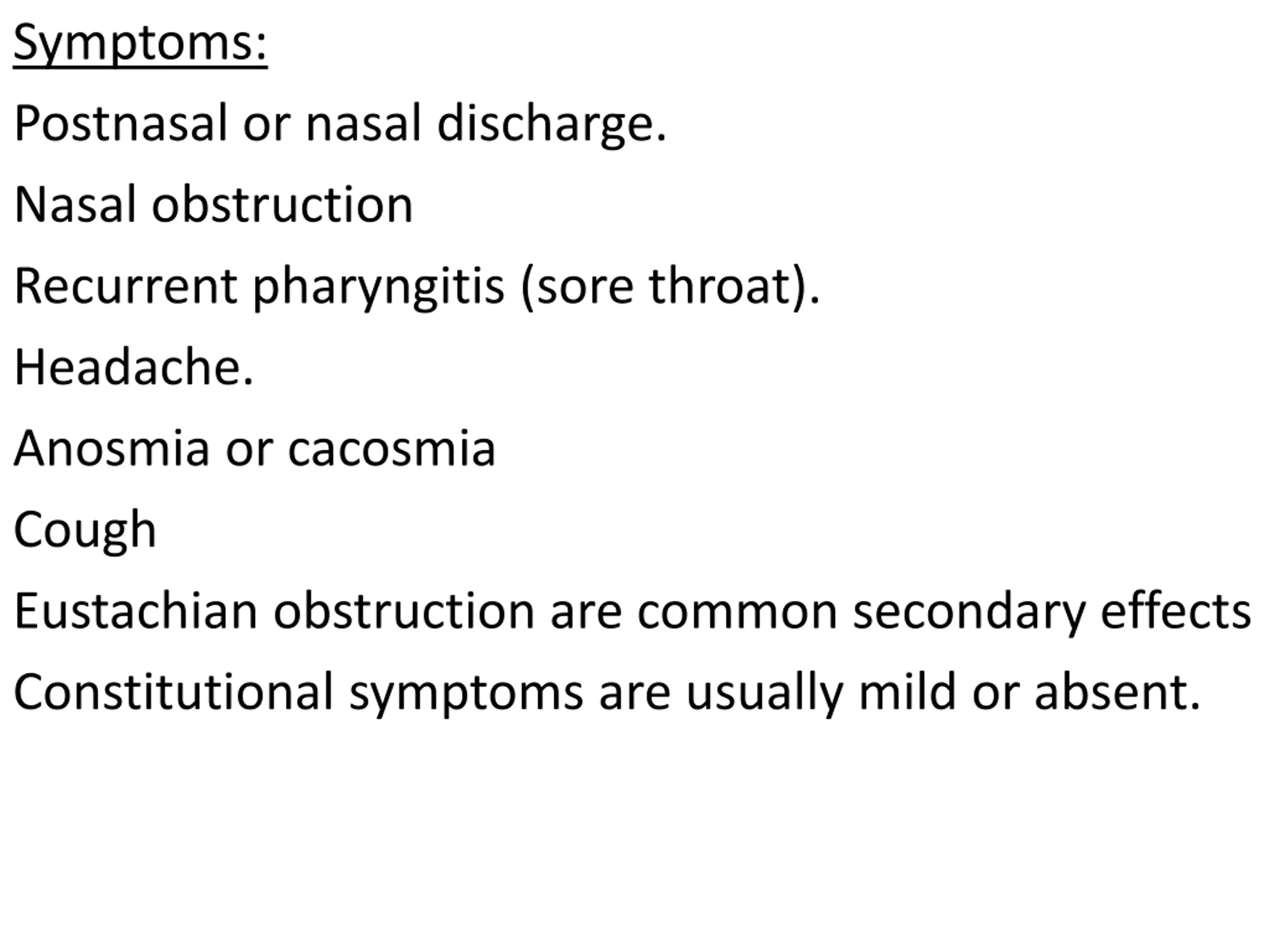Symptoms: Postnasal or nasal discharge. Nasal obstruction Recurrent pharyngitis (sore throat). Headache. Anosmia or cacosmia Cough Eustachian obstruction are common secondary effects Constitutional symptoms are usually mild or absent.