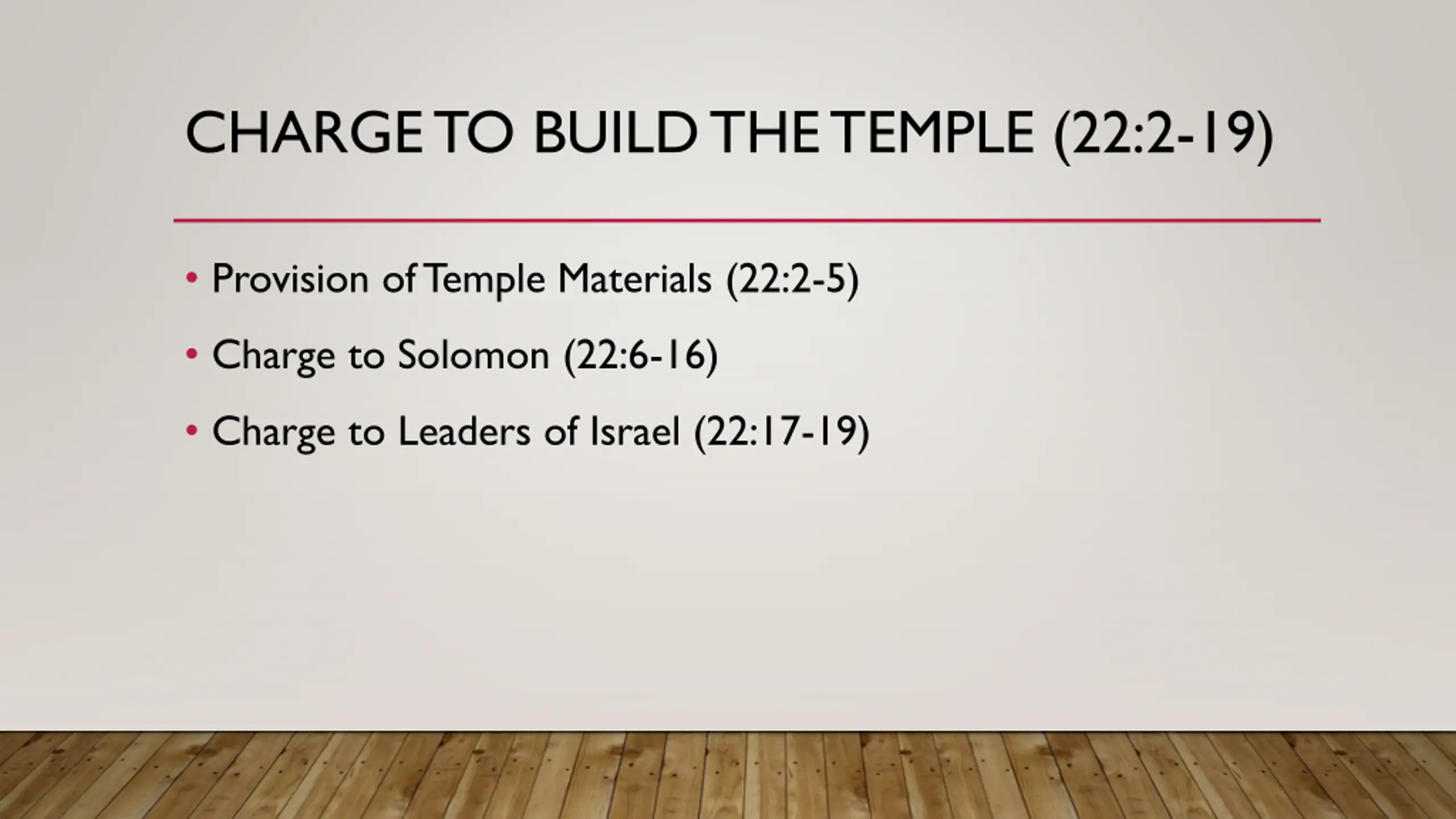 CHARGE TO BUILD THE TEMPLE (22:2-19) Provision of Temple Materials (22:2-5) Charge to Solomon (22:6-16) Charge to Leaders of Israel (22:17-19)