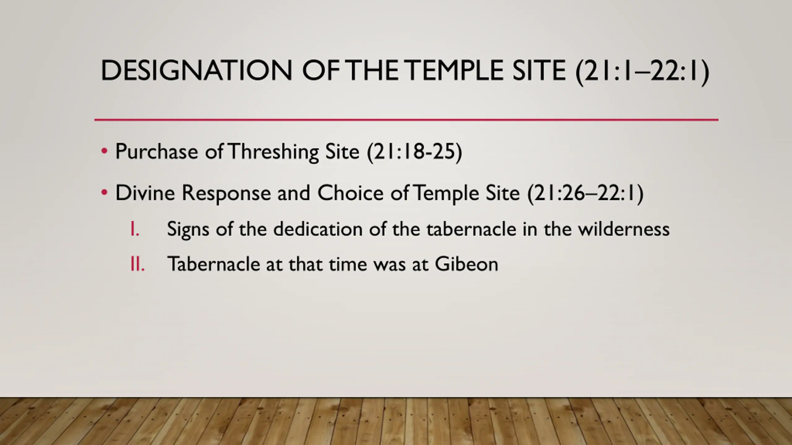 DESIGNATION OF THE TEMPLE SITE (21:122:1) Purchase of Threshing Site (21:18-25) Divine Response and Choice of Temple Site (21:26 22:1) I. Signs of the dedication of the tabernacle in the wilderness II. Tabernacle at that time was at Gibeon