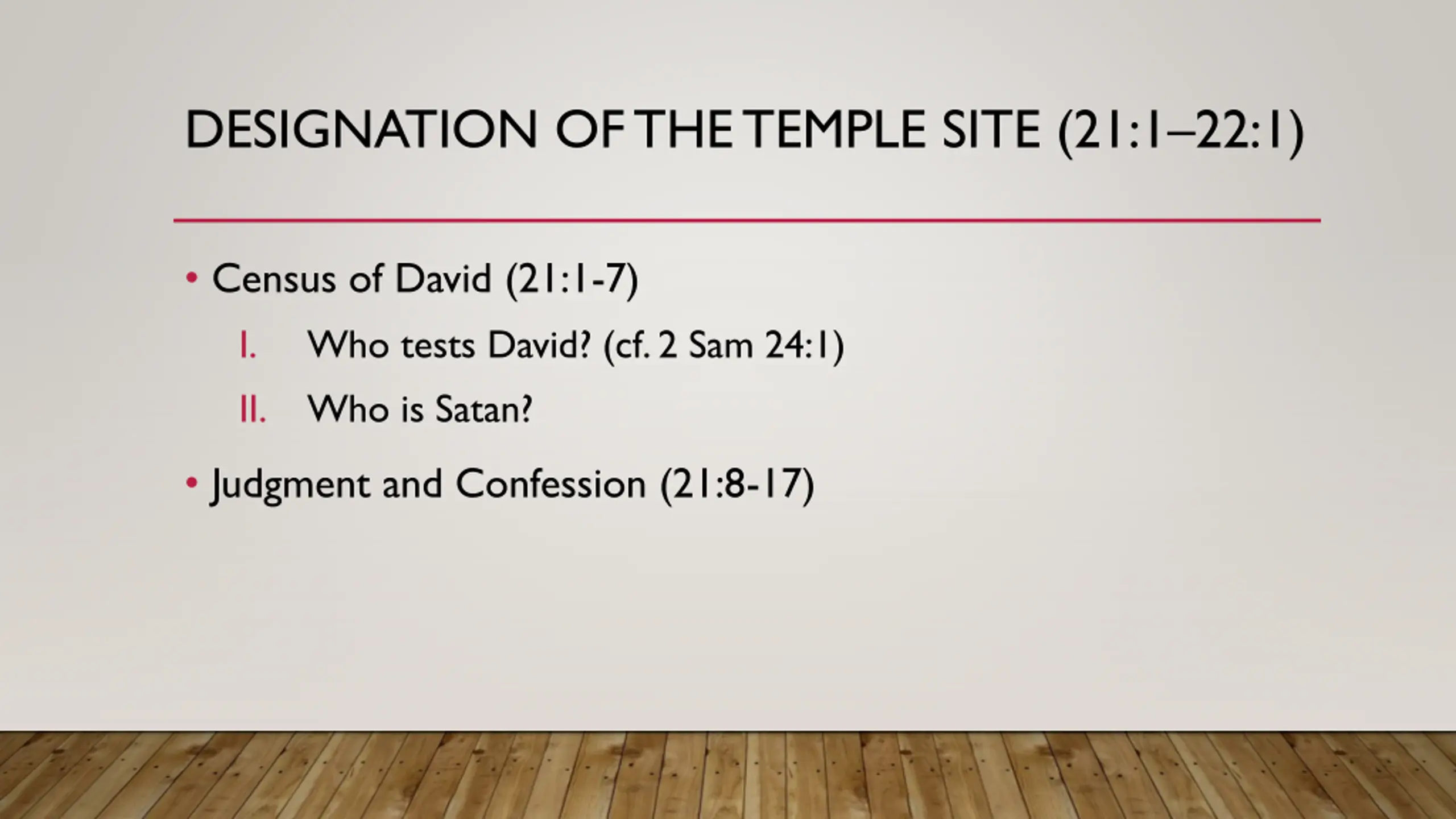 DESIGNATION OF THE TEMPLE SITE (21:122:1) Census of David (21:1-7) I. Who tests David? (cf. 2 Sam 24:1) II. Who is Satan? Judgment and Confession (21:8-17)
