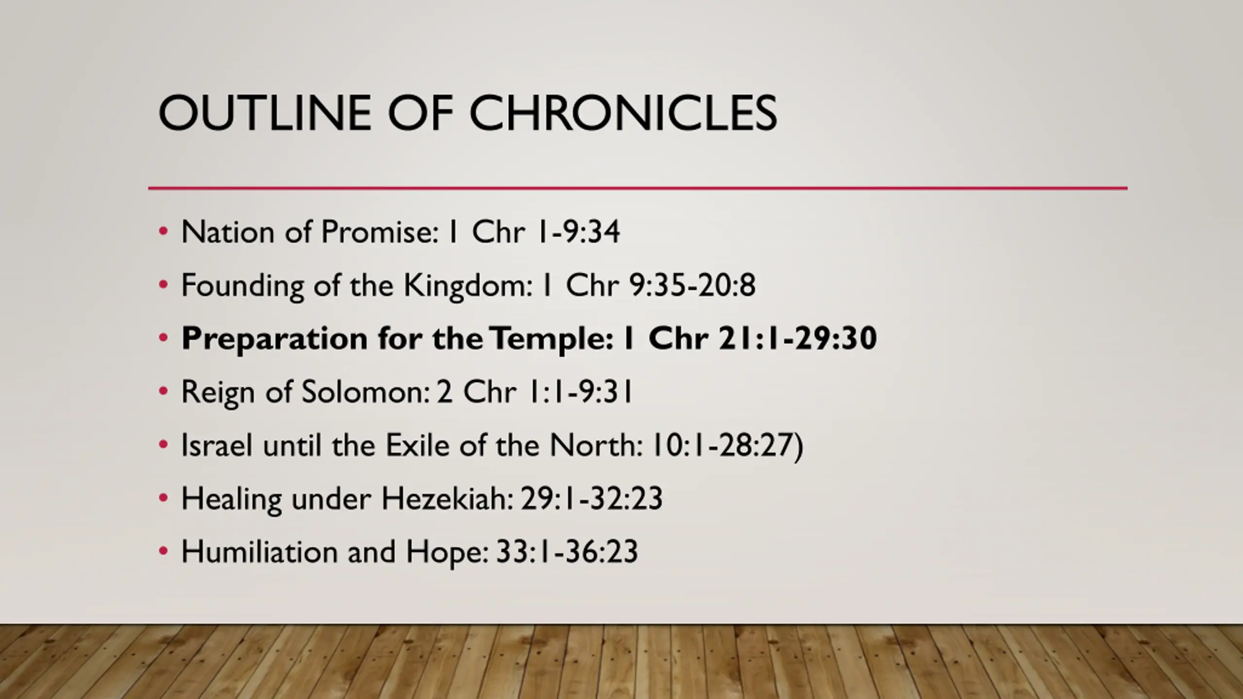 OUTLINE OF CHRONICLES Nation of Promise: 1 Chr 1-9:34 Founding of the Kingdom: 1 Chr 9:35-20:8 Preparation for the Temple: 1 Chr 21:1-29:30 Reign of Solomon: 2 Chr 1:1-9:31 Israel until the Exile of the North: 10:1-28:27) Healing under Hezekiah: 29:1-32:23 Humiliation and Hope: 33:1-36:23