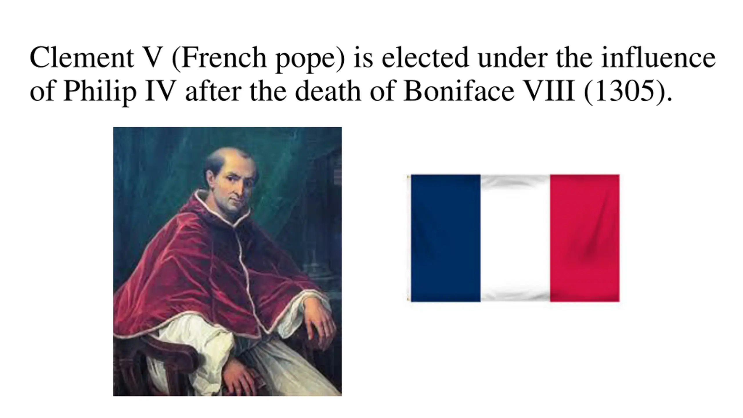 Clement V (French pope) is elected under the influence of Philip IV after the death of Boniface VIII (1305).